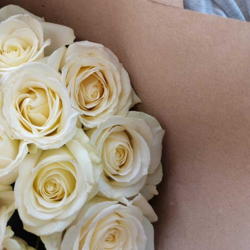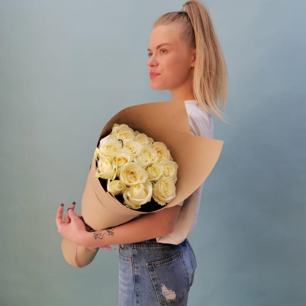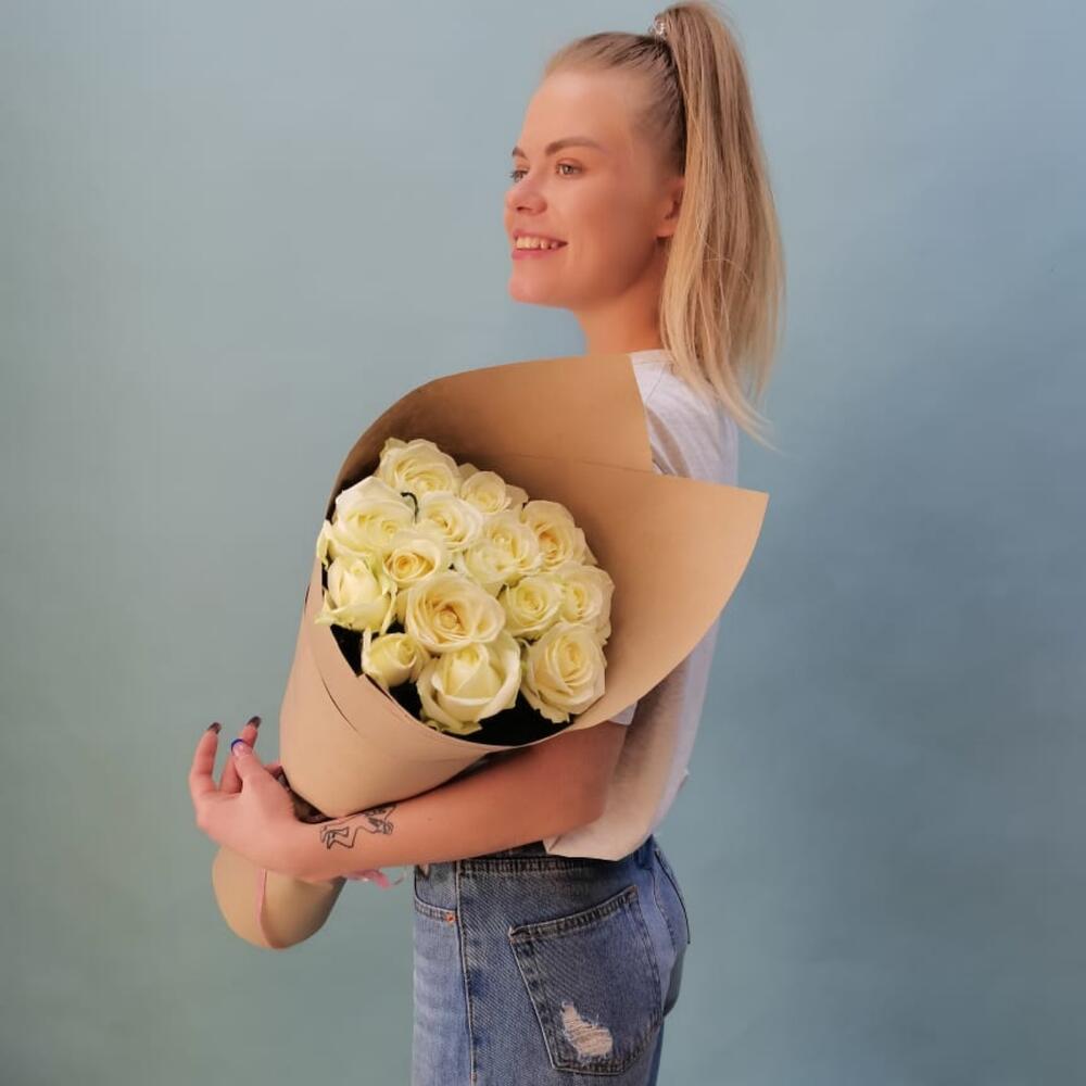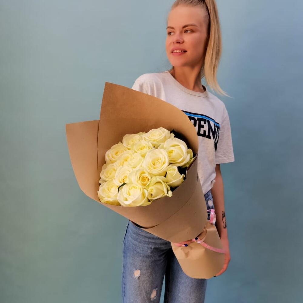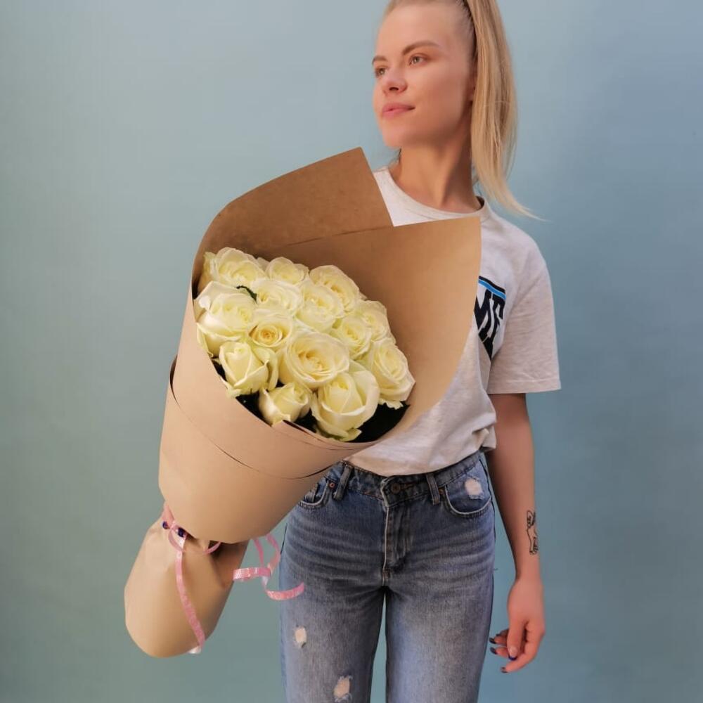 Роза – 15 шт. Лента атласная – 2 шт. Бумага – 2 шт.