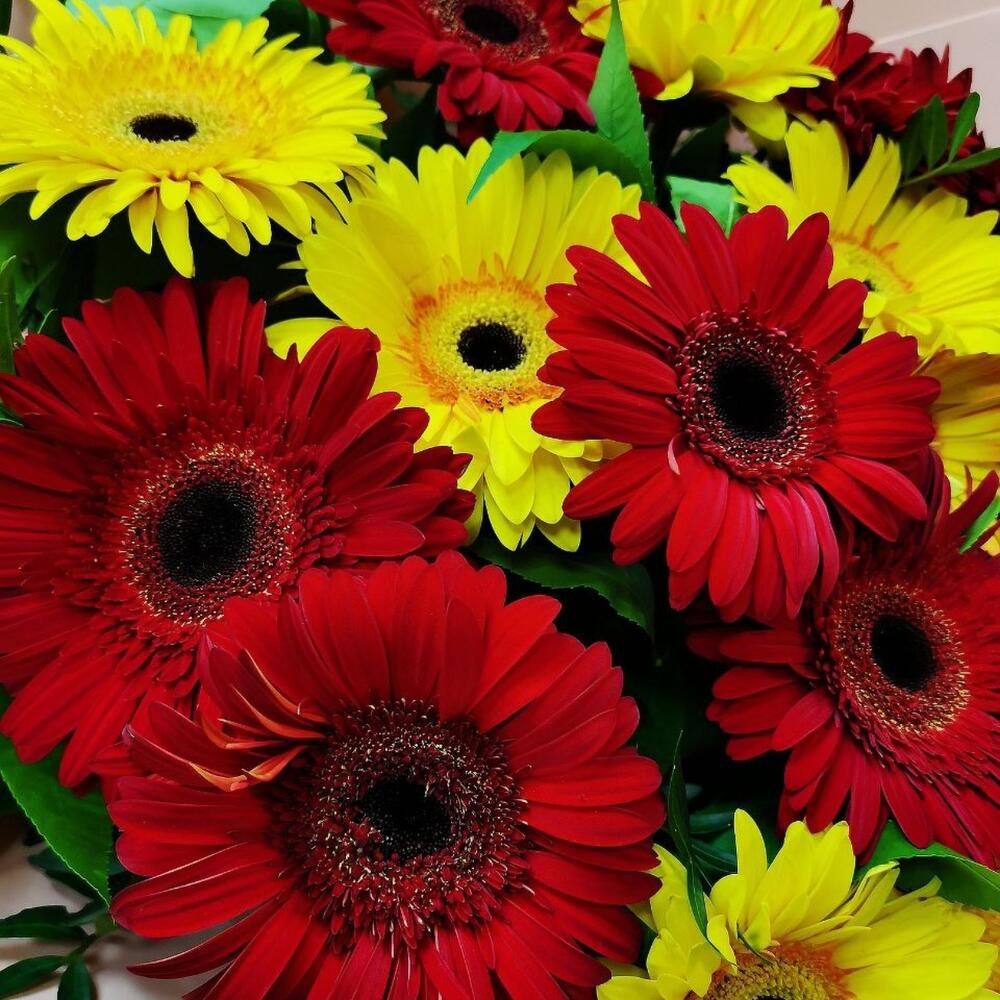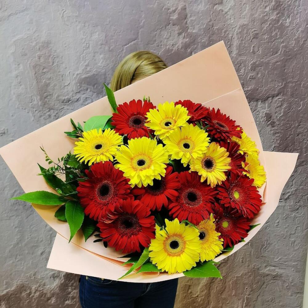 Букет из 19 разноцветных гербер в дизайнерской упаковке