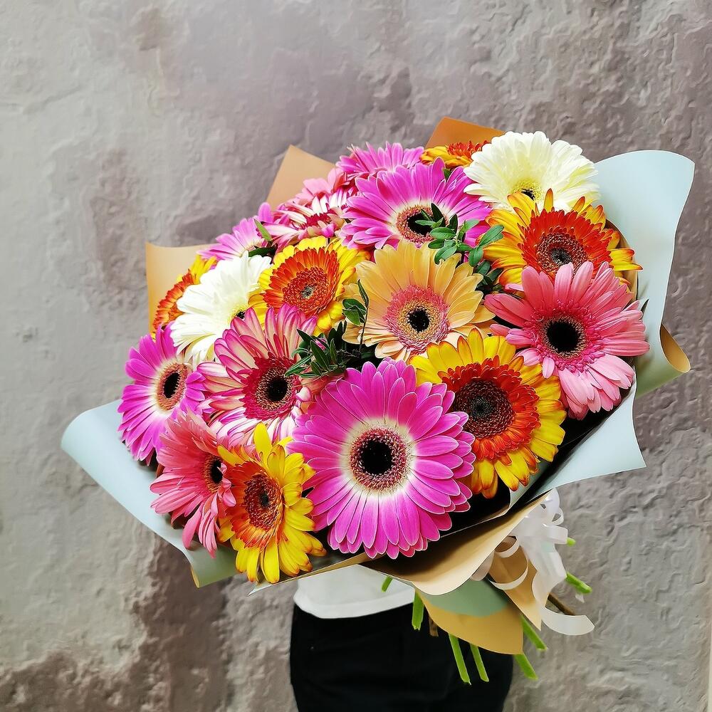 Букет из 19 разноцветных гербер в дизайнерской упаковке