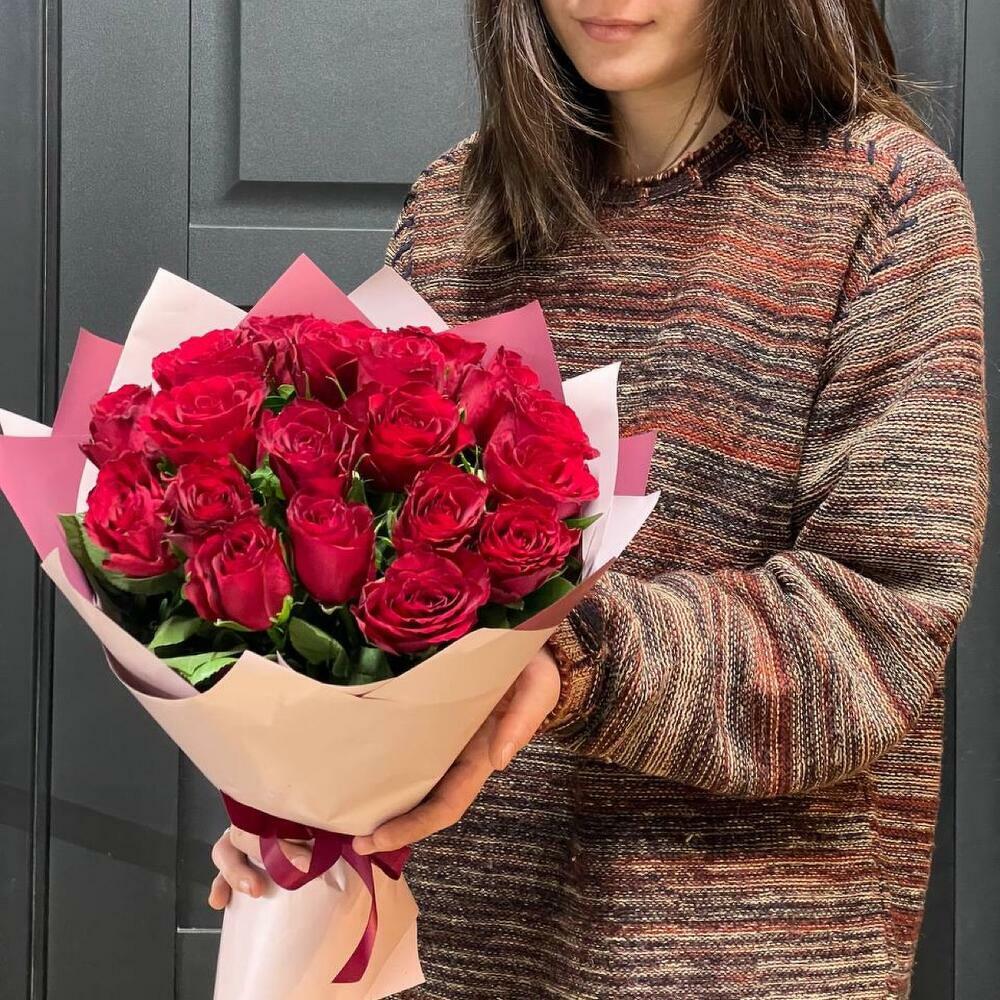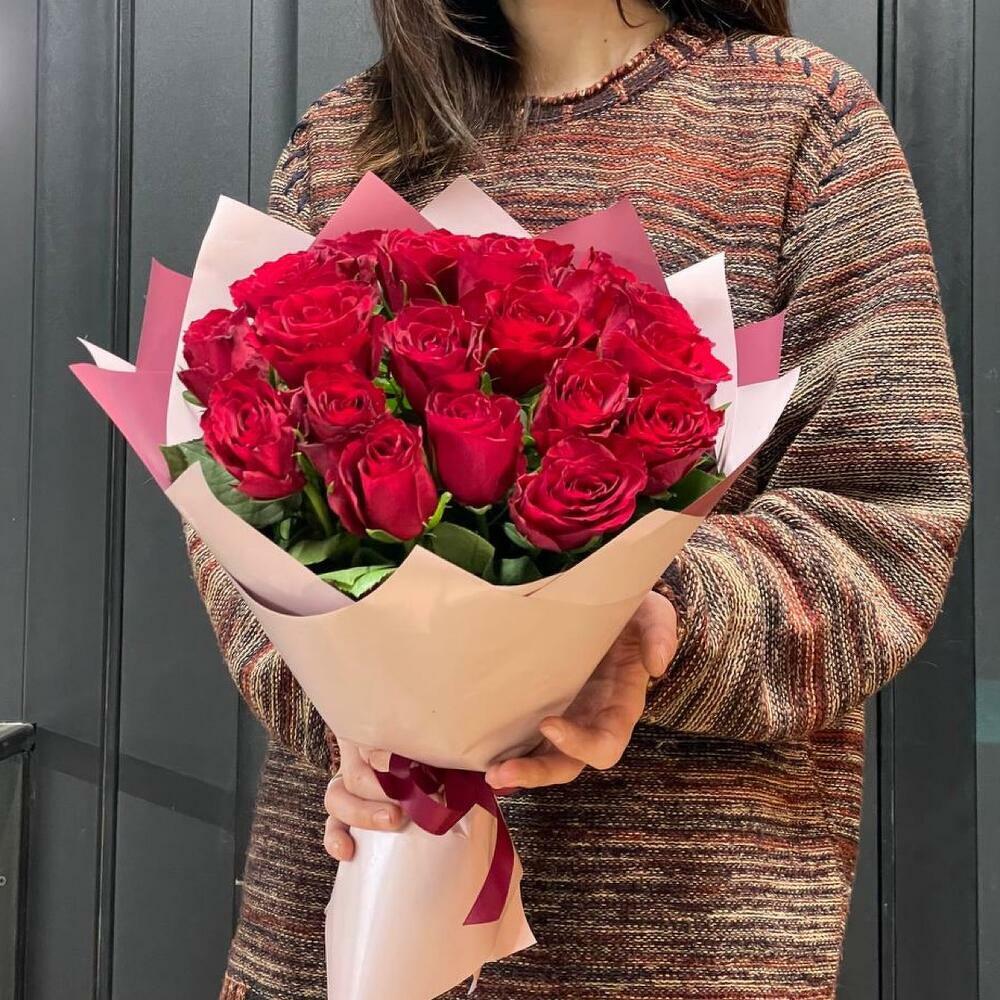 Лента – 1 шт. Роза – 19 шт. Матовая пленка – 3 шт.