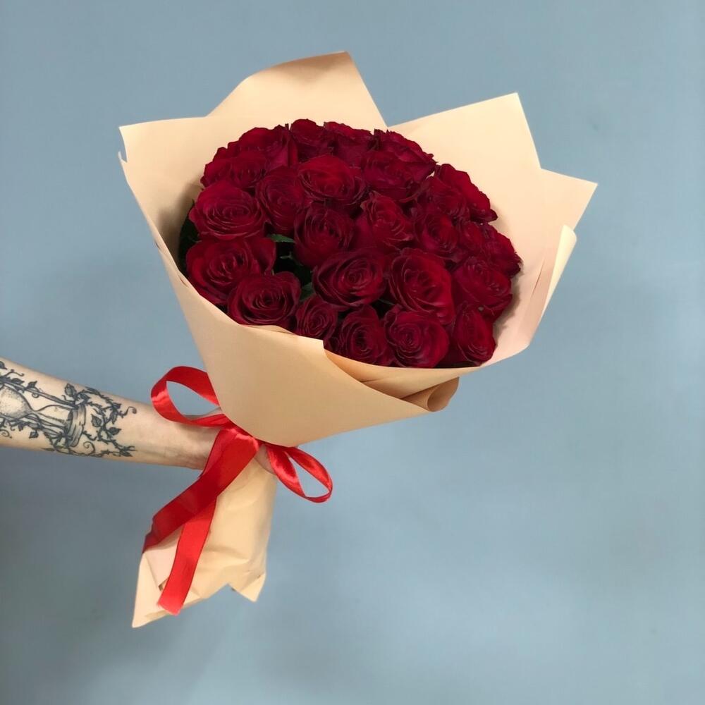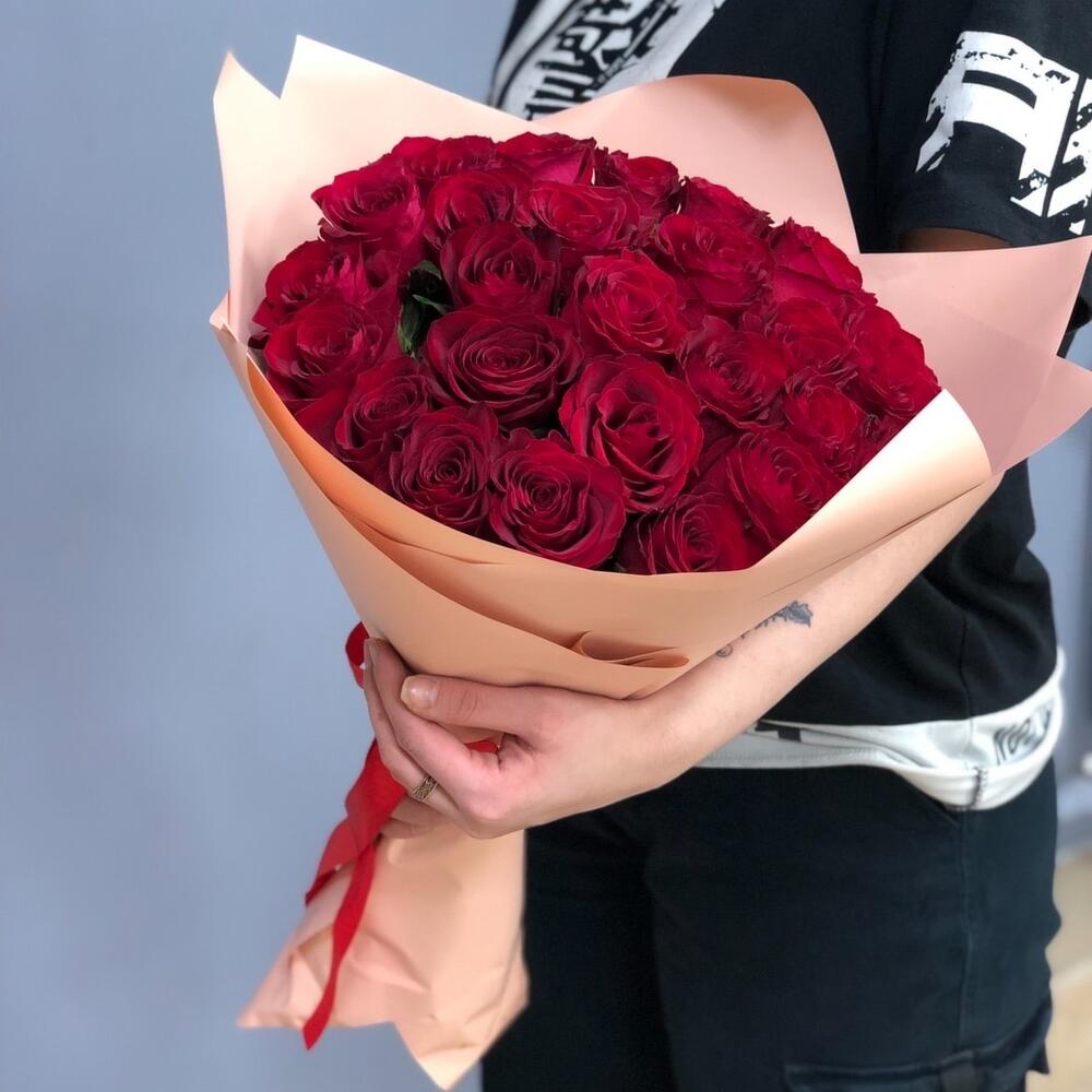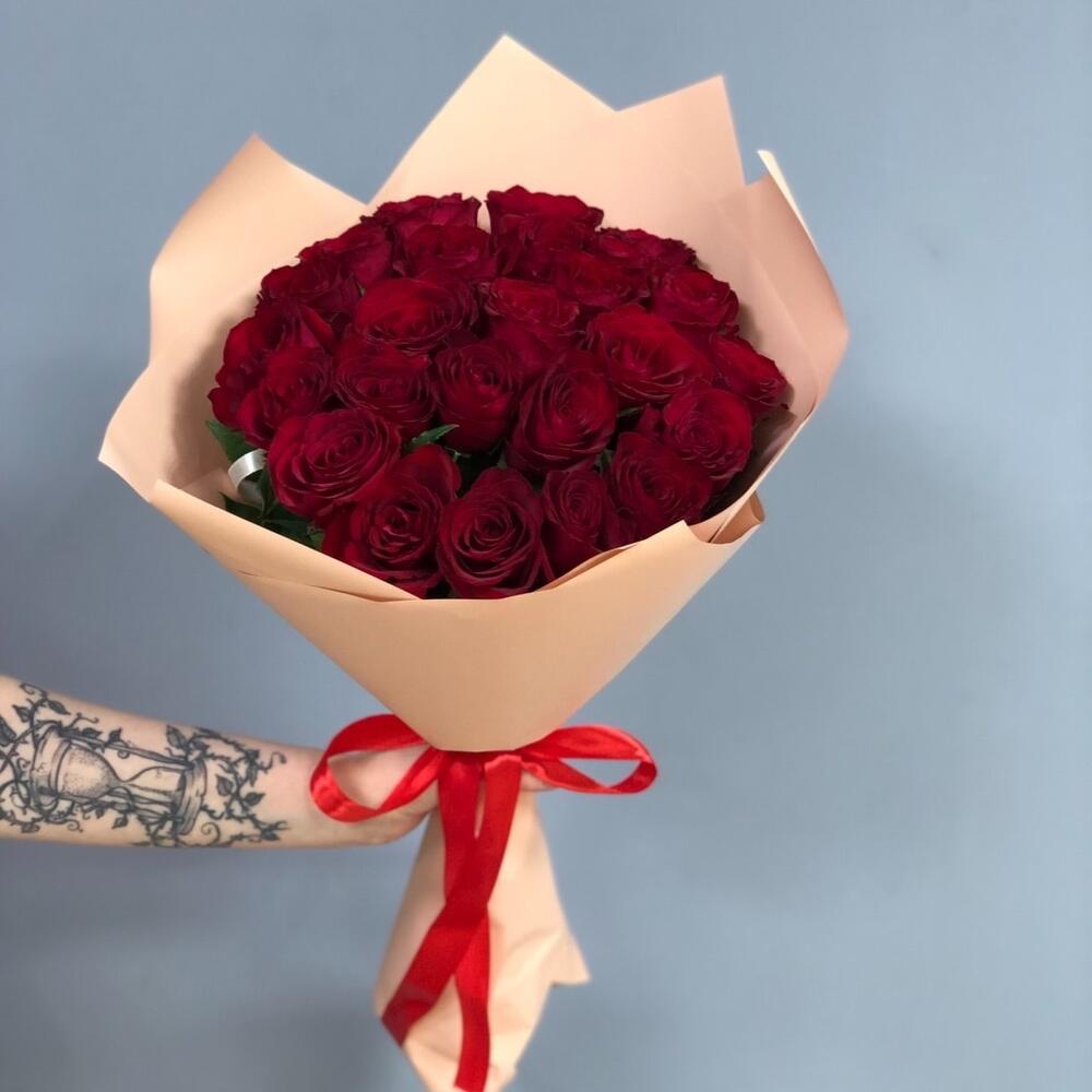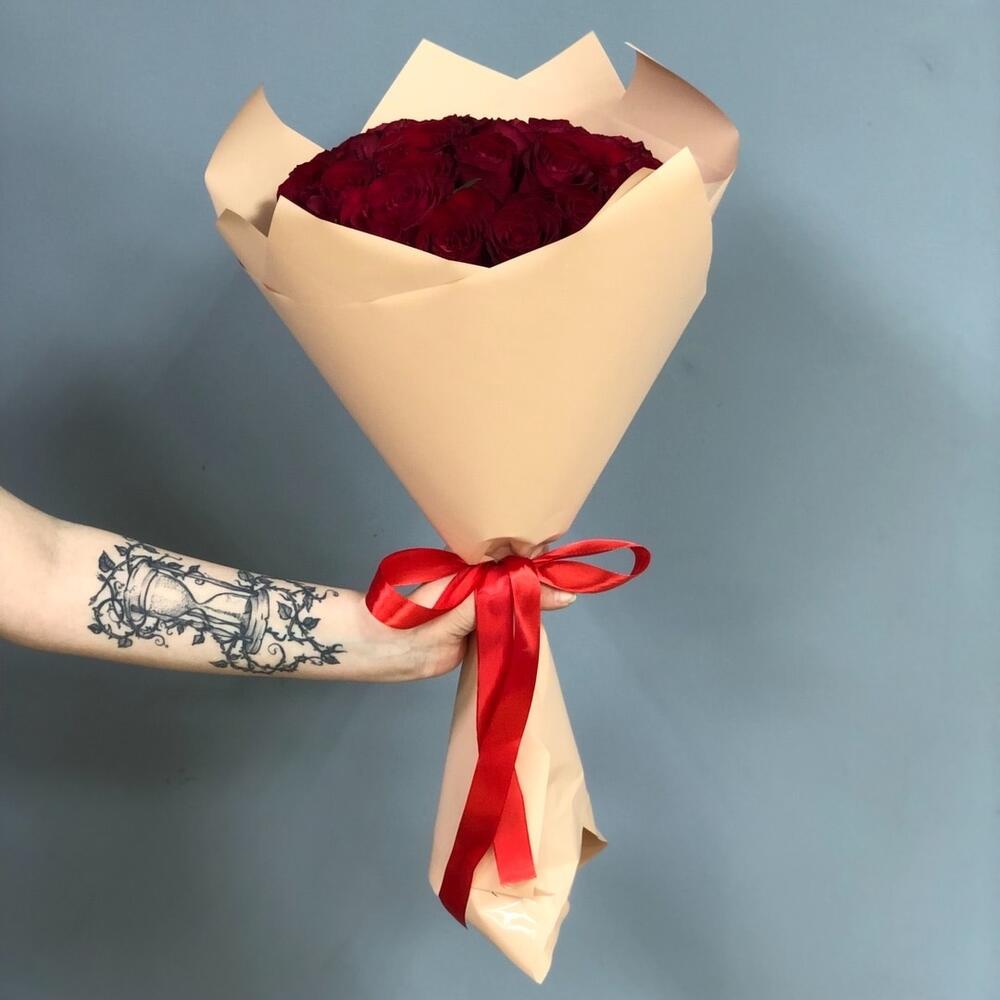 Роза одноголовая – 25 шт. Лента атласная – 1 шт. Пленка матовая – 2 шт.