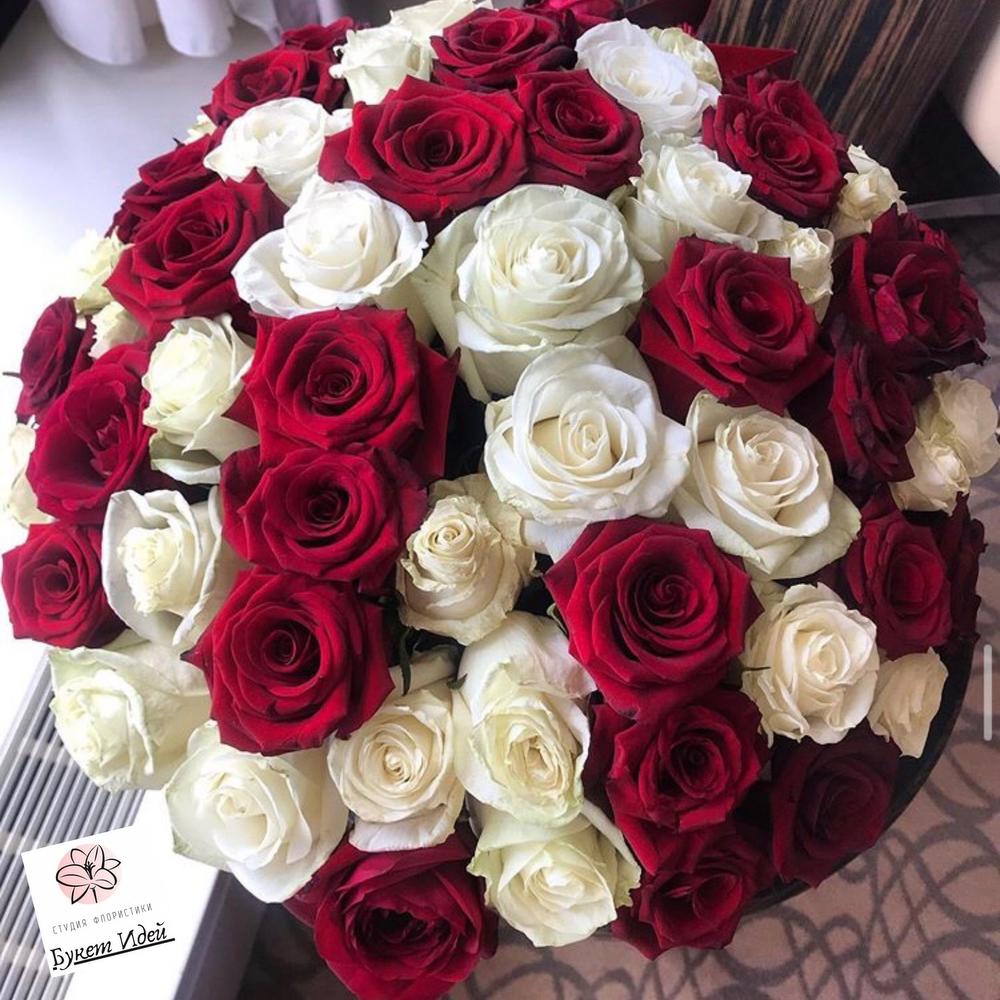 Роза красная - 26 шт. Упаковка - 6 шт. Лента атласная - 1 шт. Роза белая - 25 шт.