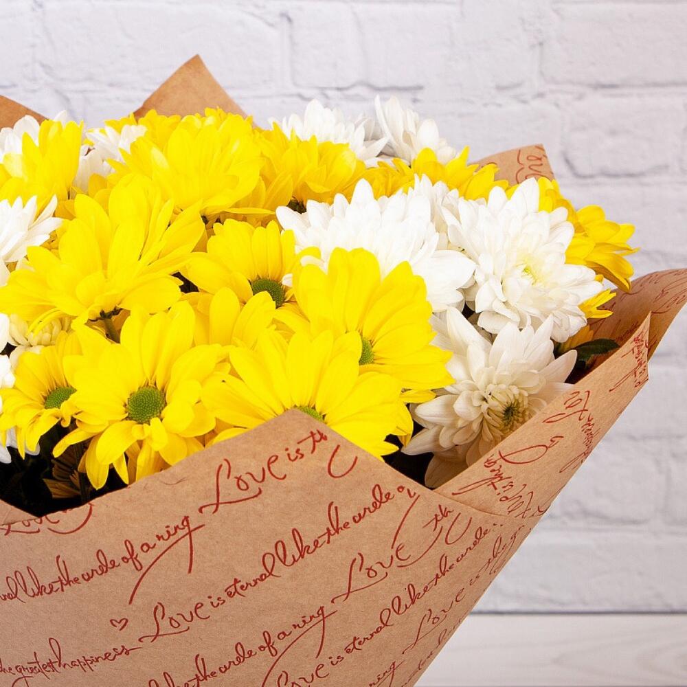 Хризантема кустовая - 7 шт. Лента атласная - 2 шт. Упаковка крафт - 4 шт.