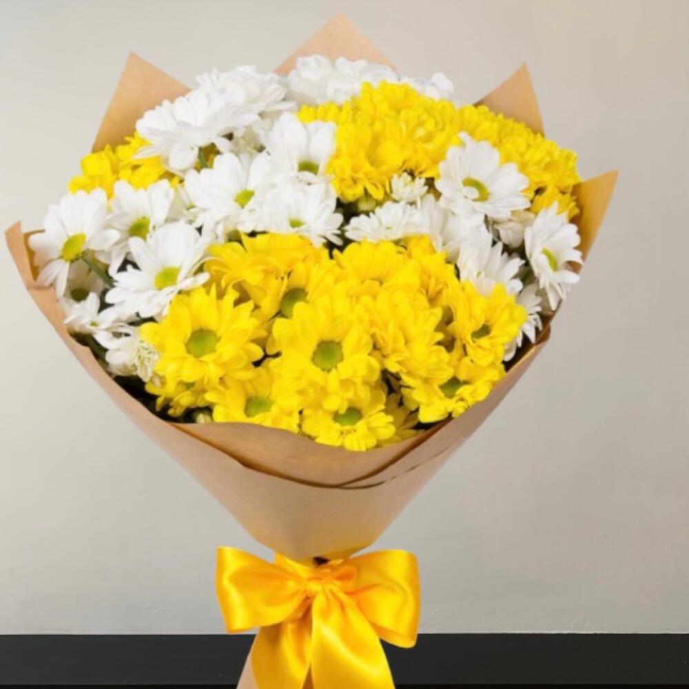 Хризантема кустовая - 7 шт. Лента атласная - 2 шт. Упаковка дизайнерская - 4 шт.