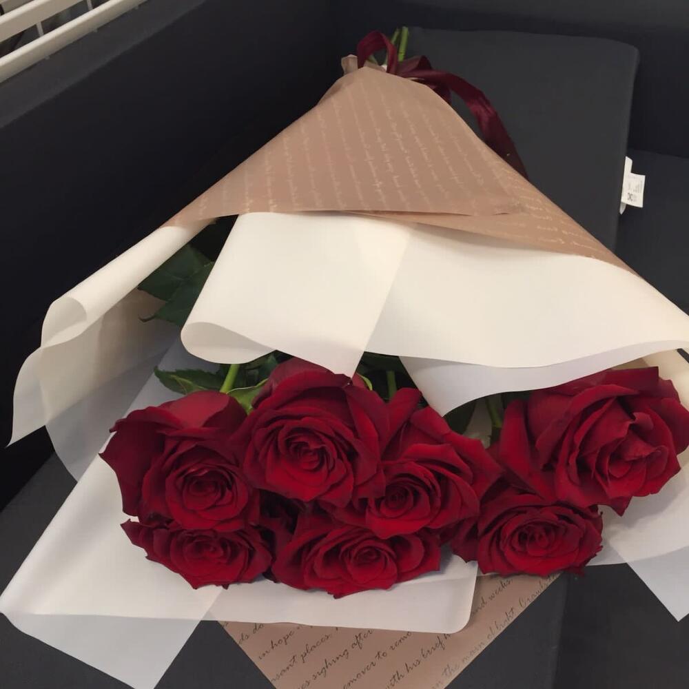 Лента атласная – 1 шт. Упаковка дизайнерская – 2 шт. Роза красная 60 см – 7 шт.