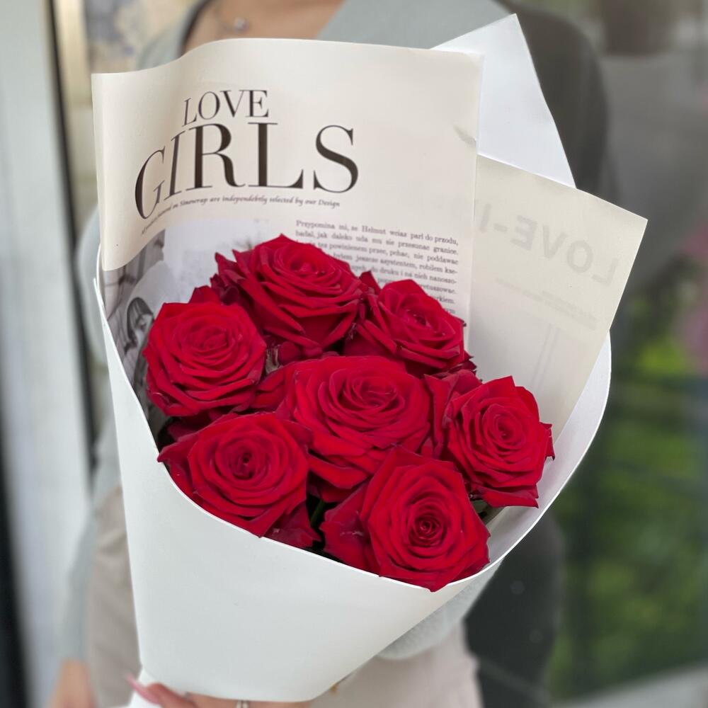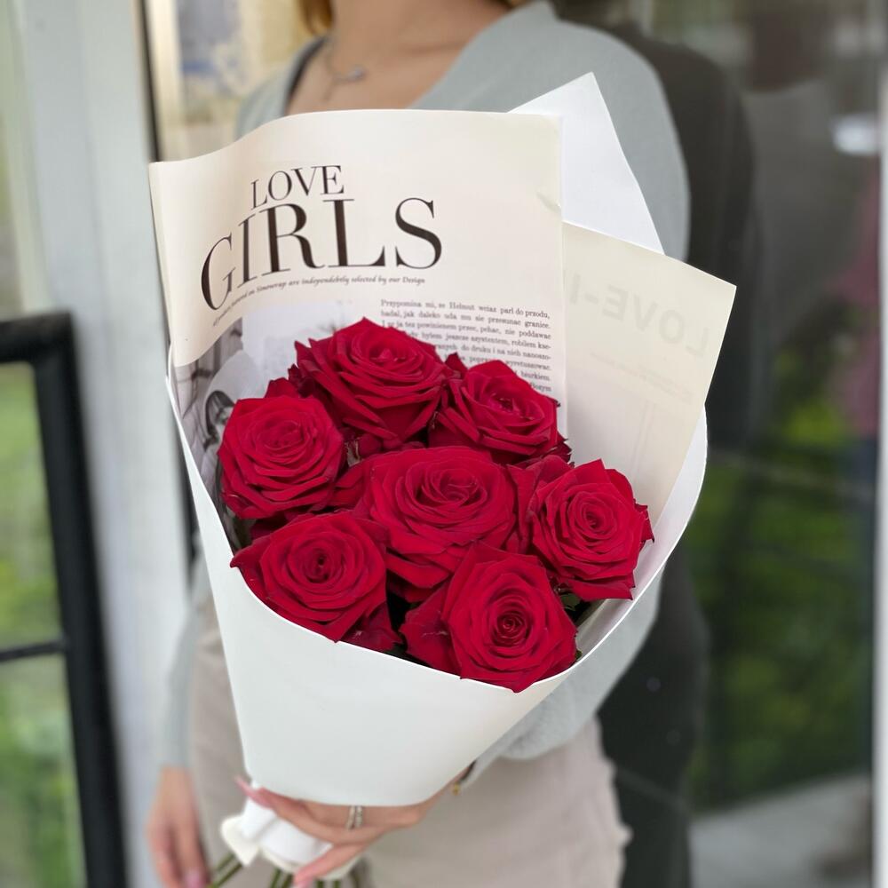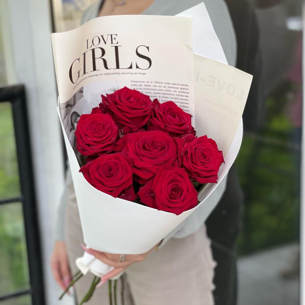 Упаковка дизайнерская – 1 шт. Средство для продления жизни цветов – 1 шт. розы красные – 7 шт.