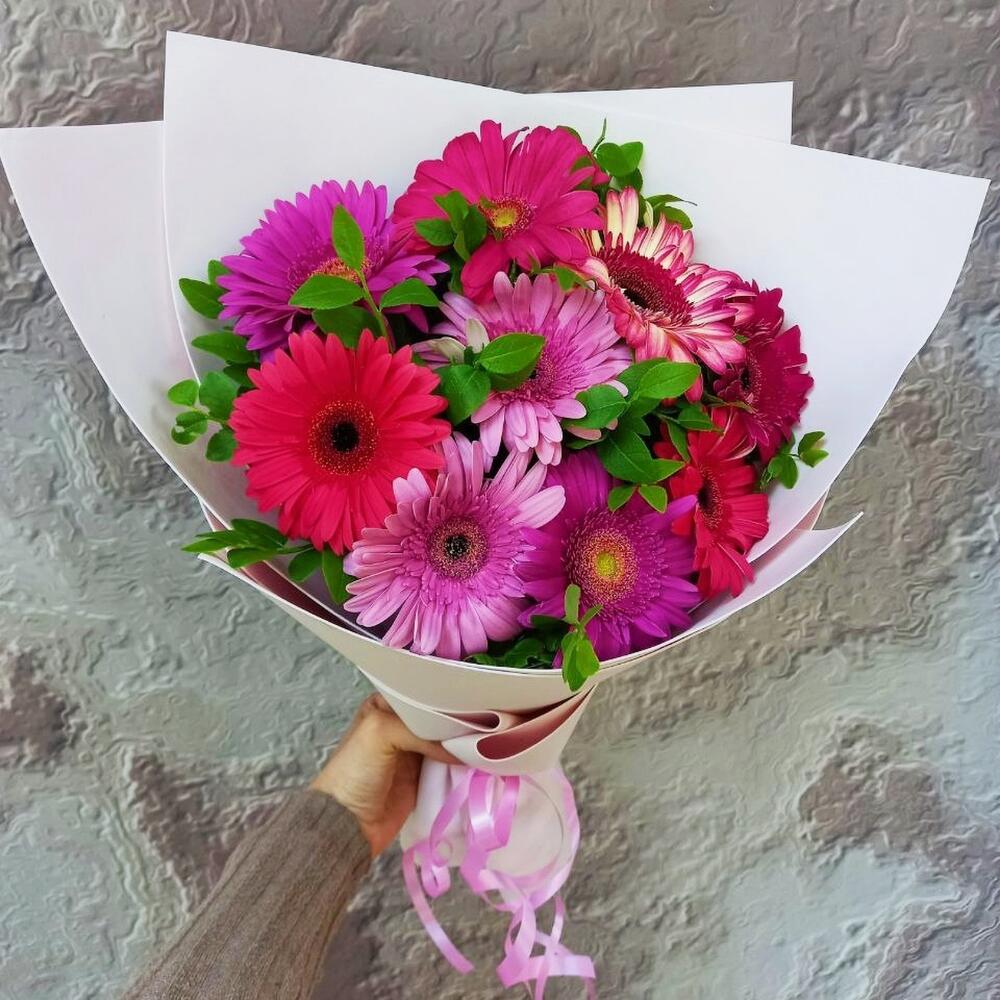 Гербера – 9 шт. Фисташка – 5 шт. Упаковка дизайнерская – 2 шт. лента декоративная – 1 шт. любовь флориста (бесплатно) – 1 шт.