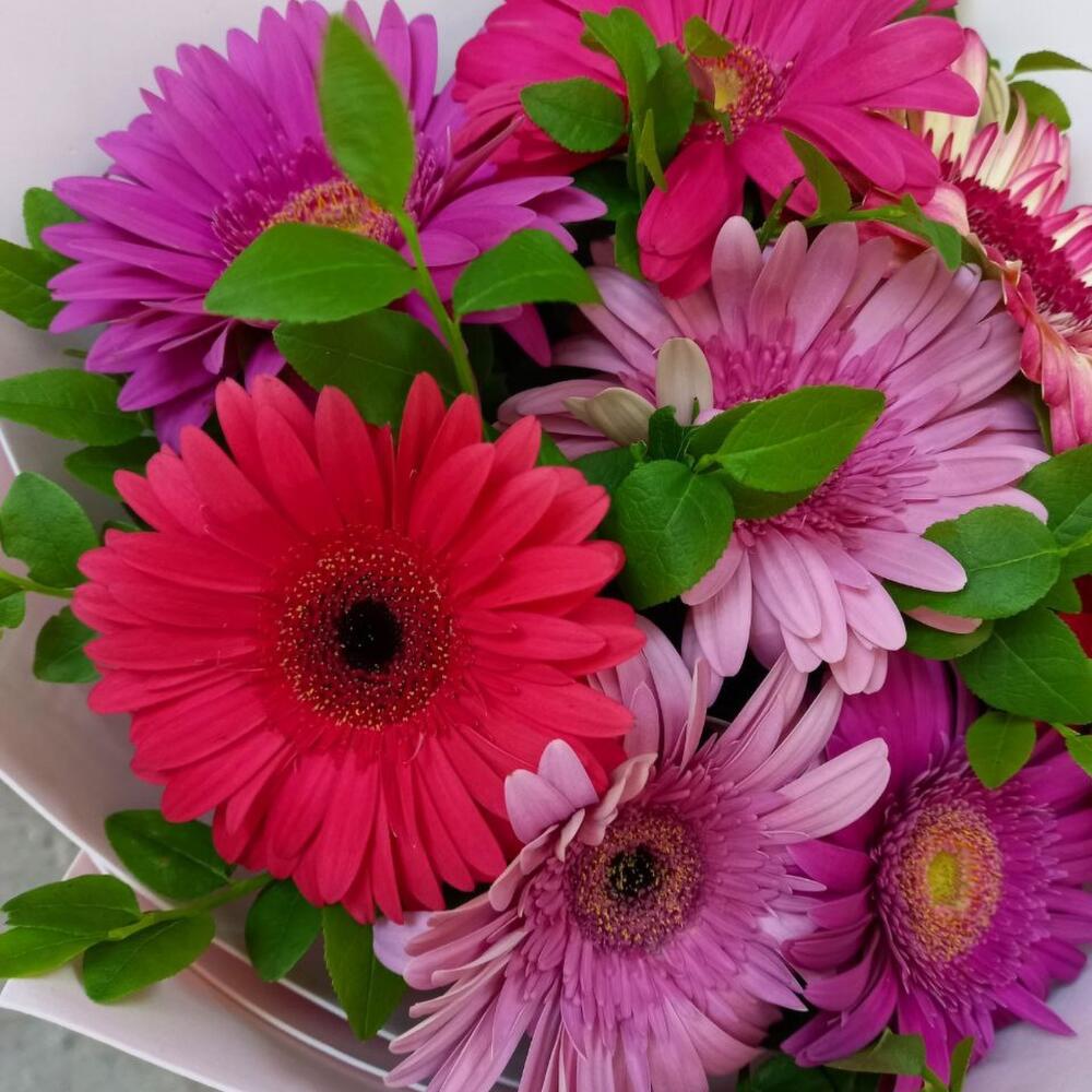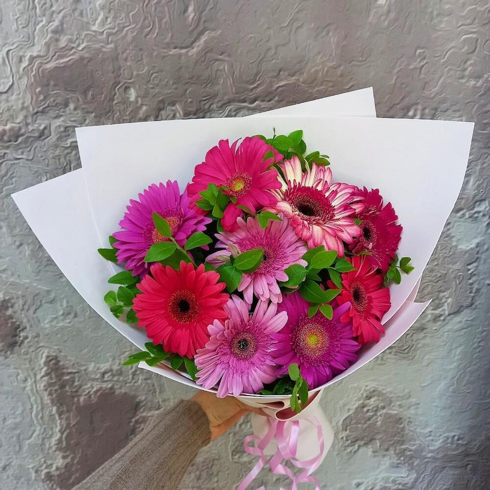 Букет из 9 разноцветных гербер в дизайнерской упаковке