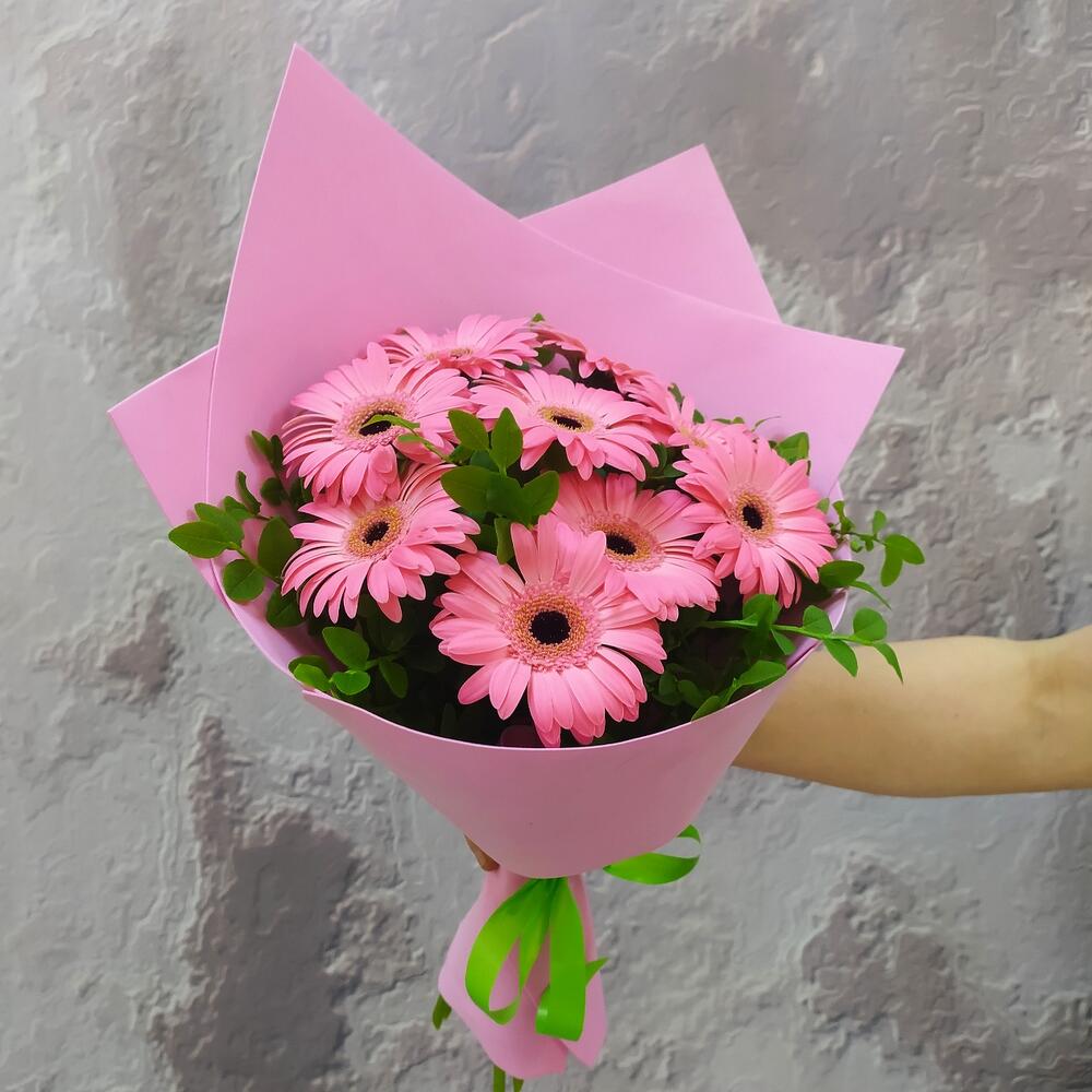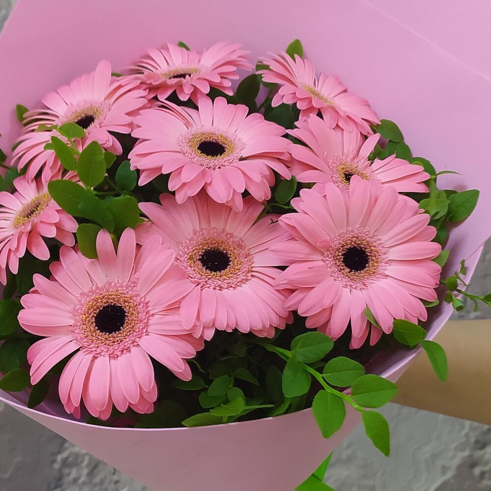 Лента – 1 шт. Зелень – 5 шт. Гербера мини – 9 шт. Фоамиран – 1 шт.