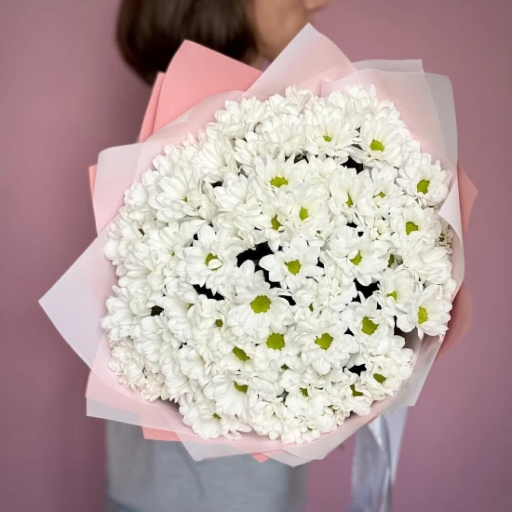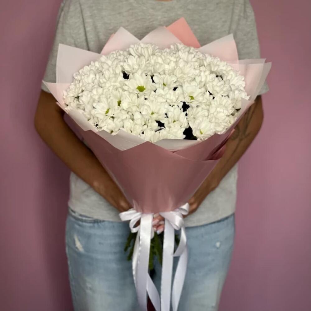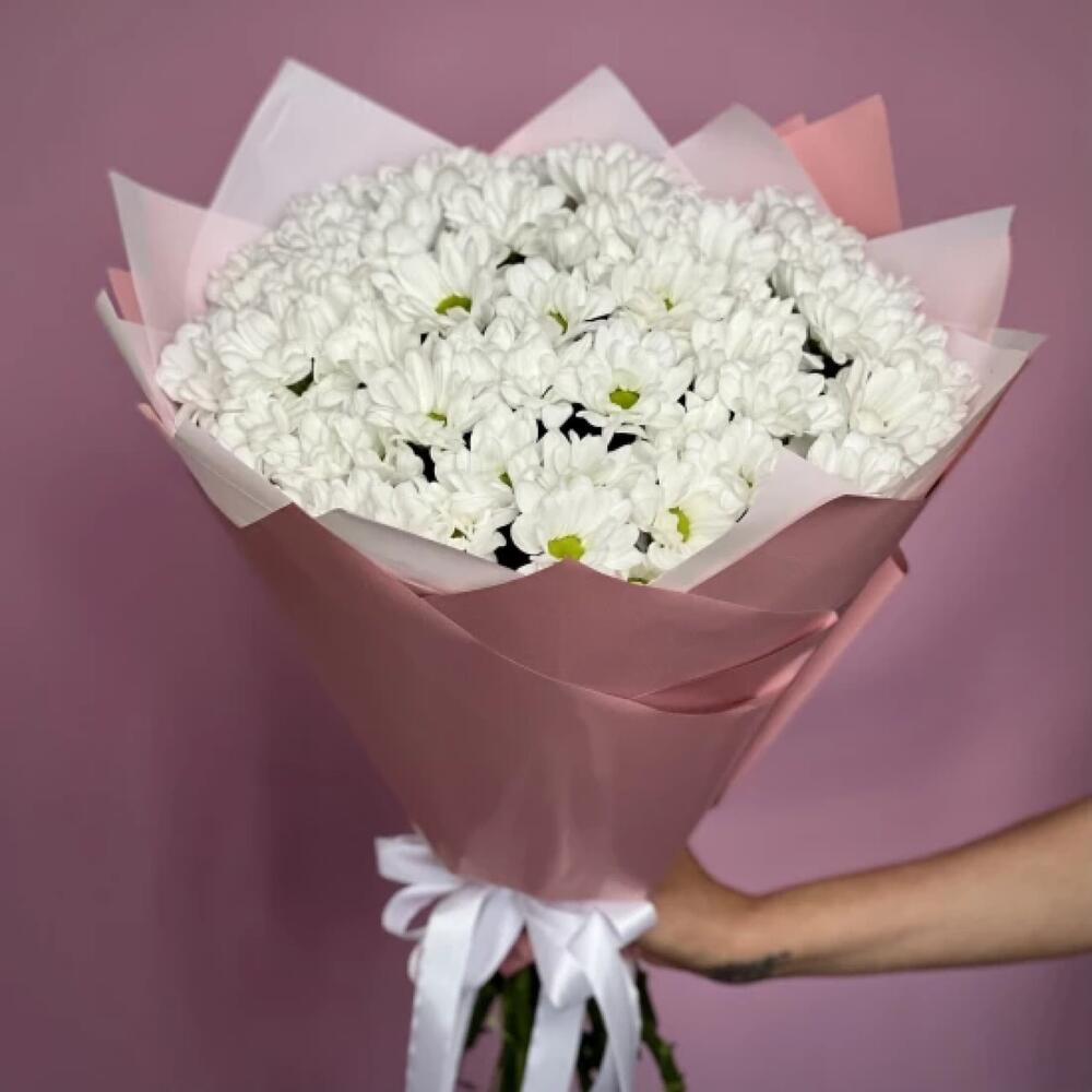 Нежный букет из ромашковой хризантемы в розовом оформлении с атласной лентой.