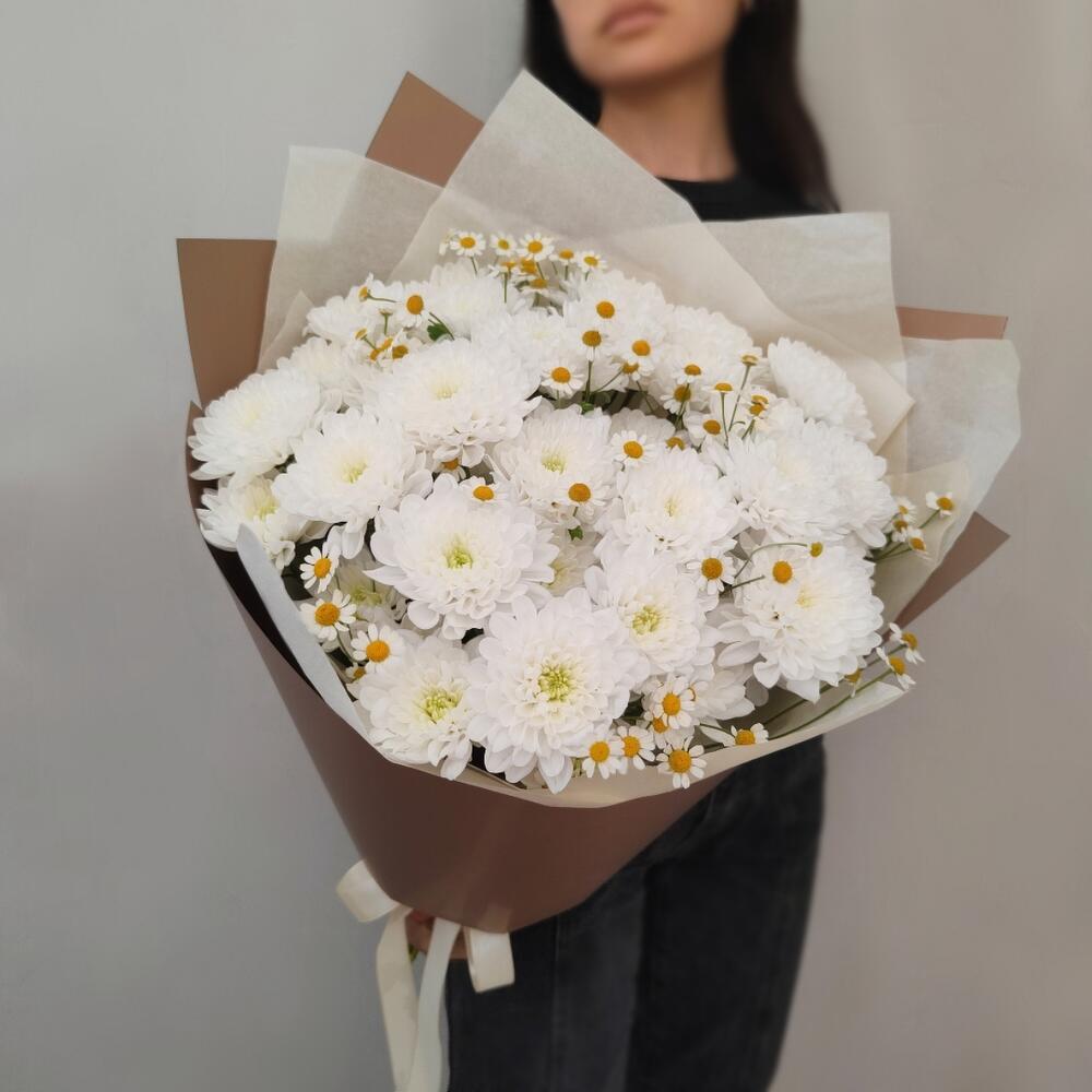 Букет из белых кустовых хризантем и ромашек.Размер букета около 42 см в ширину при высоте 50 см.Инструкция по уходу за букетом и подкормка для цветов бесплатно!