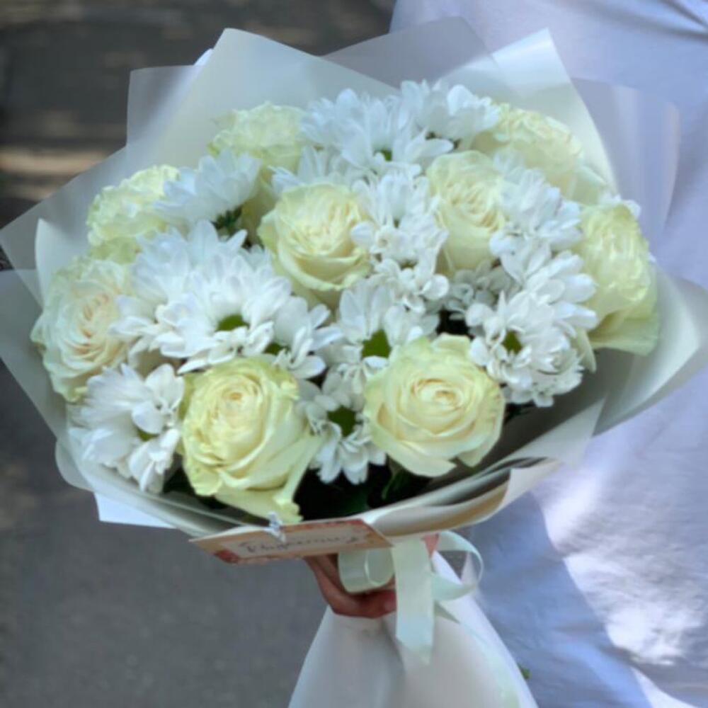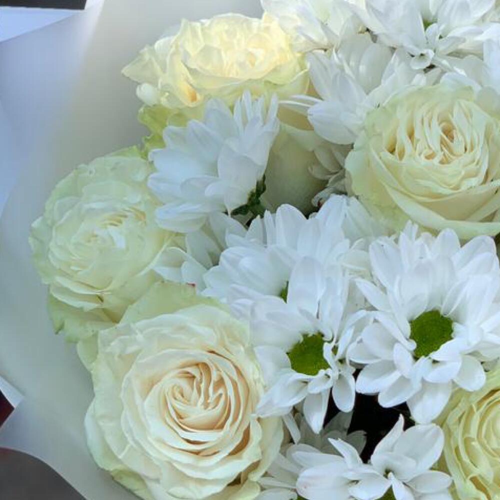 Букет из белых роз и белых хризантем