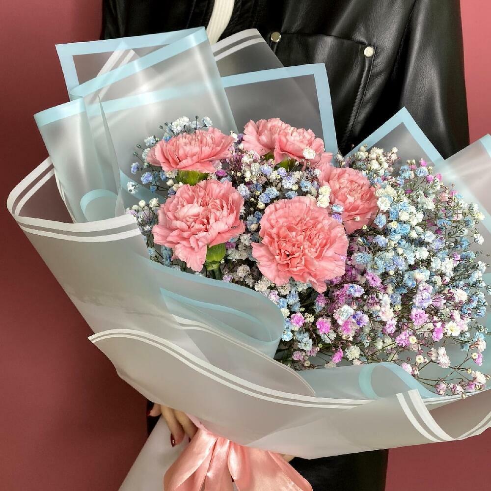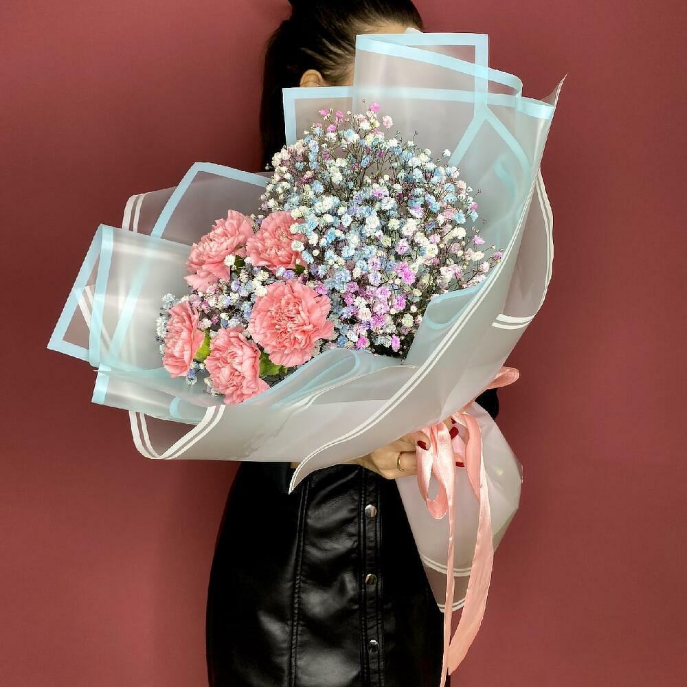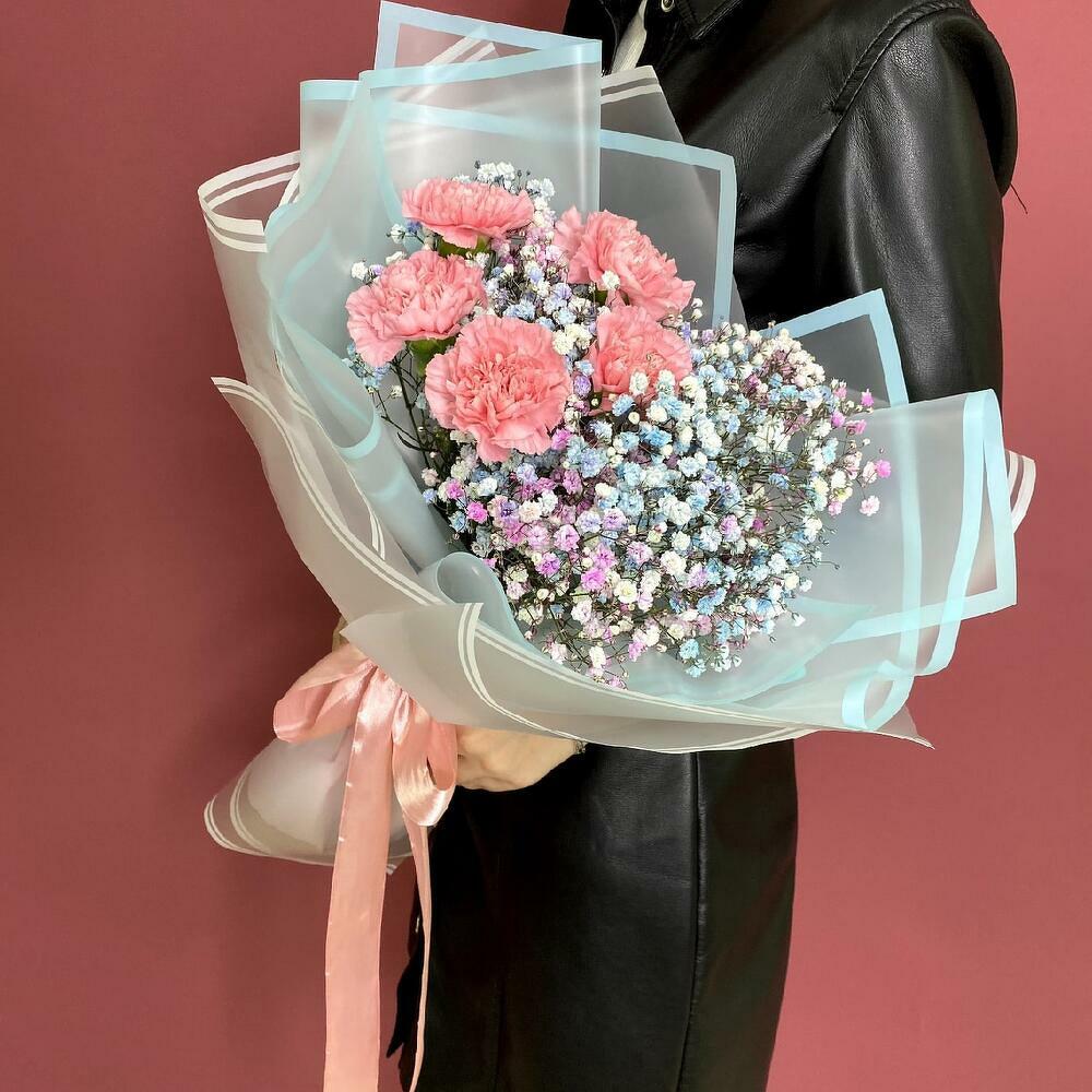 Гипсофила - 4 шт. Лента атласная - 1 шт. Диантус - 5 шт. Дизайнерская упаковка - 2 шт.