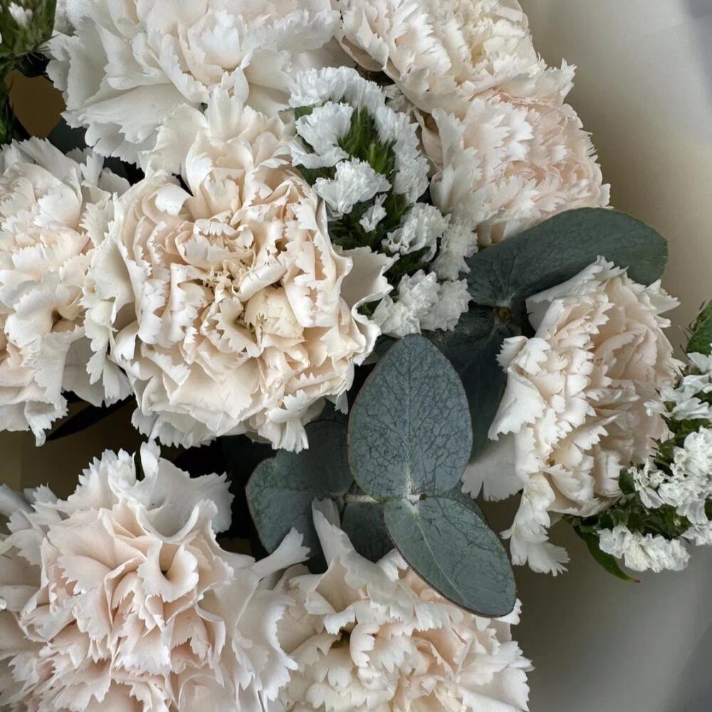 Статица - 2 шт. Эвкалипт - 4 шт. Лента атласная - 1 шт. Диантус - 15 шт. Дизайнерская упаковка - 2 шт.