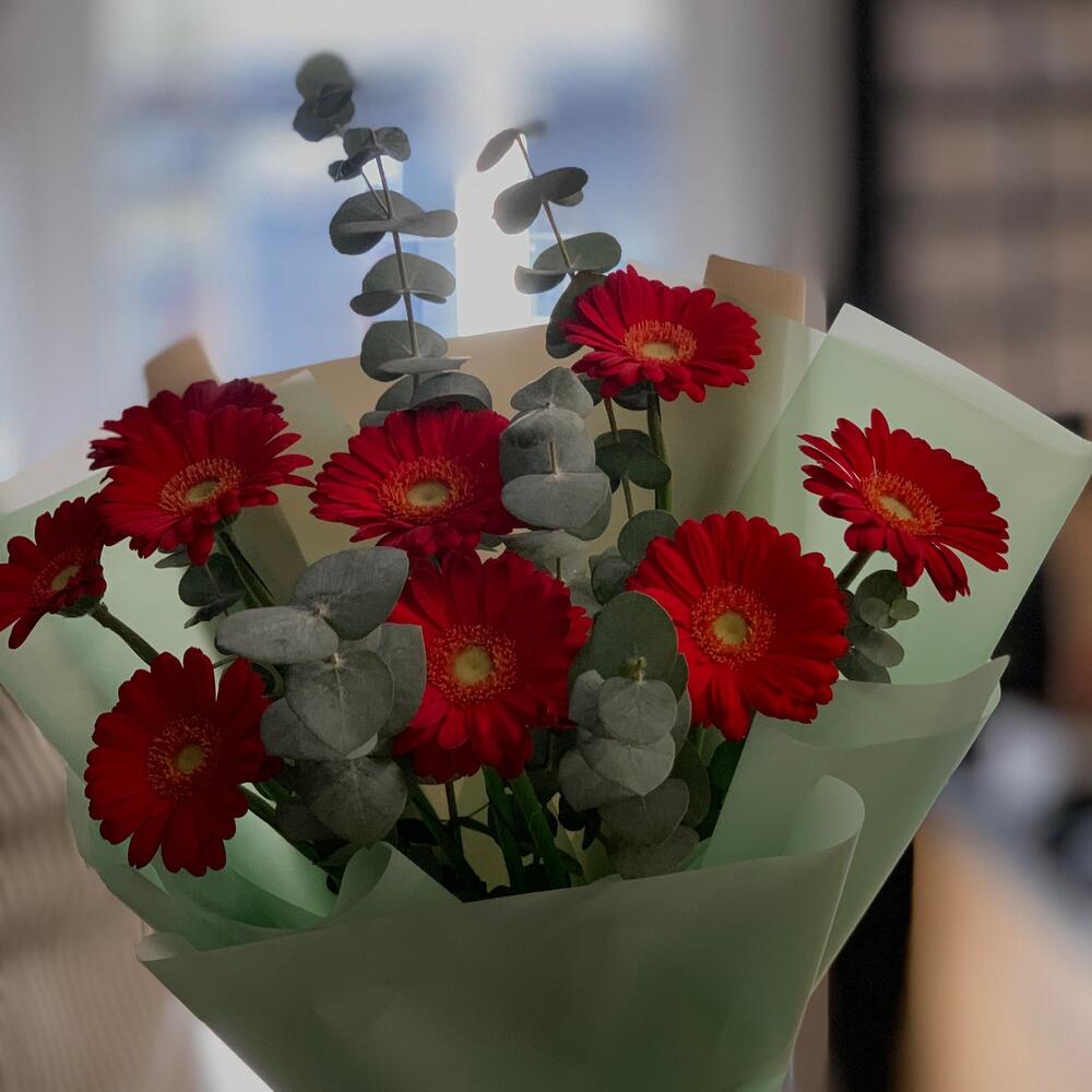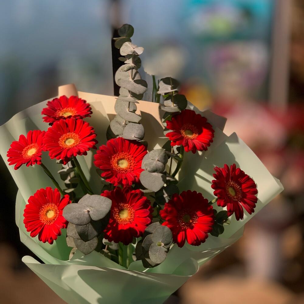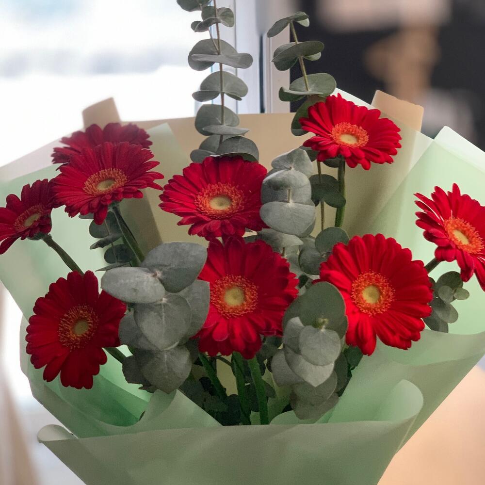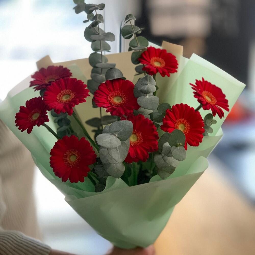Эвкалипт - 2 шт. Лента атласная - 1 шт. Гербера мини - 9 шт. Упаковка пленка матовая - 4 шт.