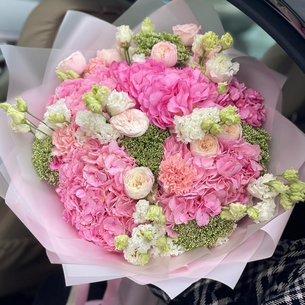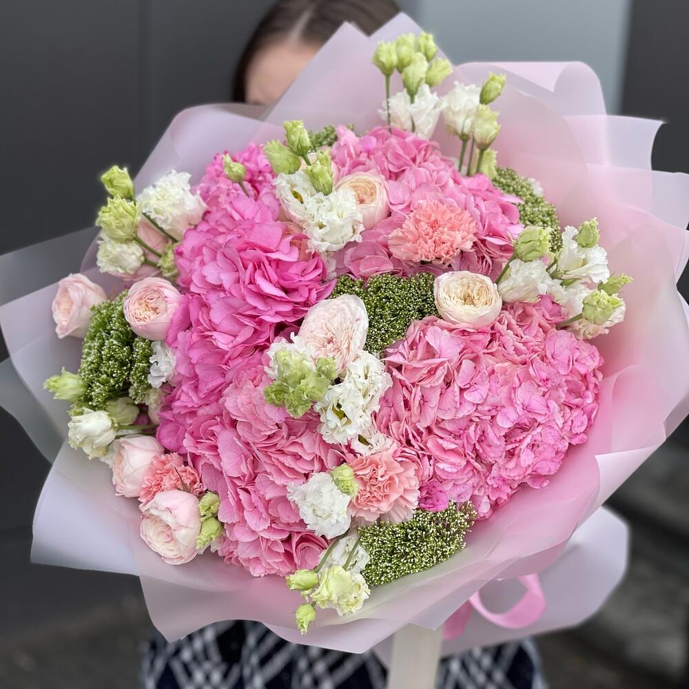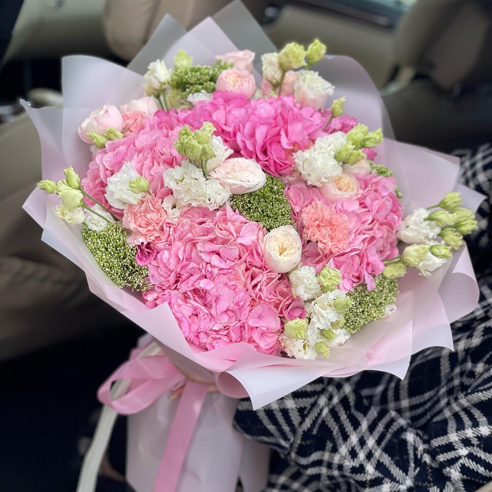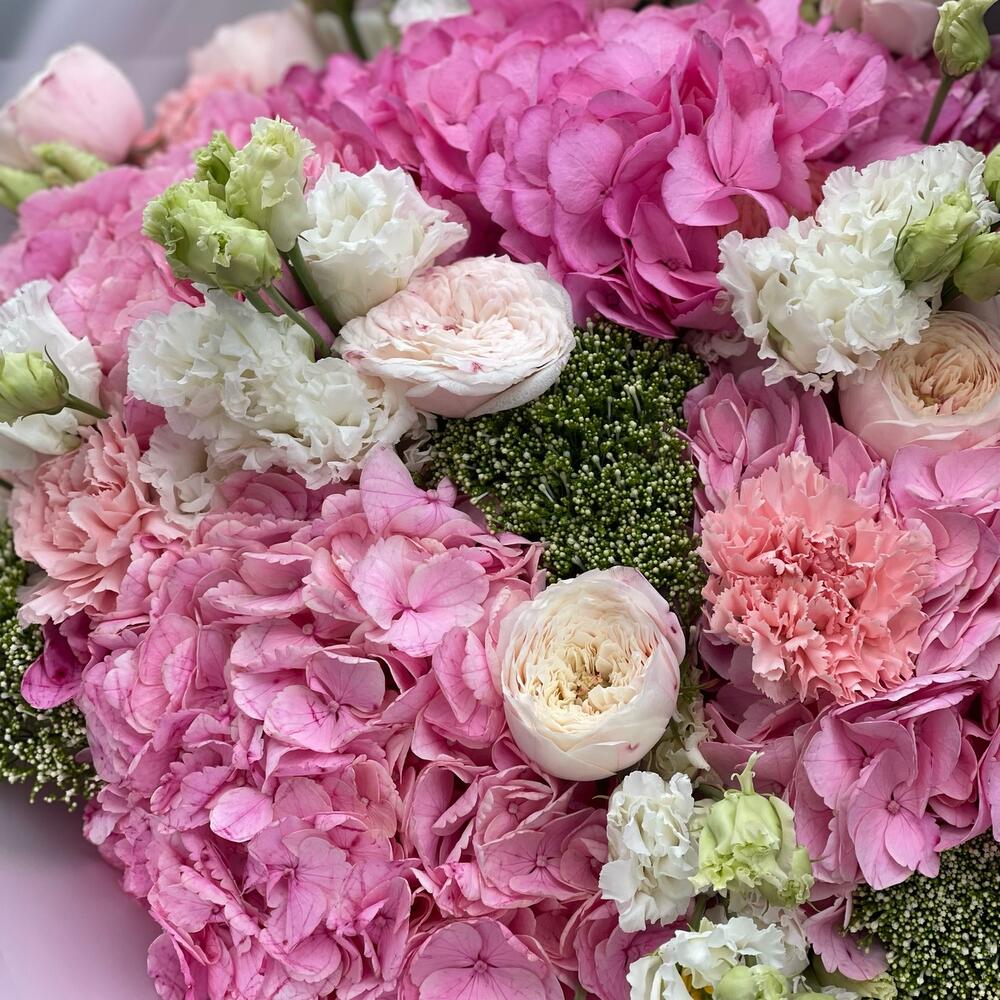 Гортензия – 5 шт. Озотамнус – 5 шт. Диантус – 3 шт. Роза кустовая пионовидная – 3 шт. Упаковка дизайнерская – 1 шт. эустома белая – 7 шт. открытка с вашими пожеланиями – 1 шт. памятка по уходу и подкормка для цветов – 2 шт.