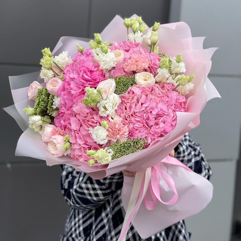 Гортензия - 5 шт. Озотамнус - 5 шт. Диантус - 3 шт. Роза кустовая пионовидная - 3 шт. Упаковка дизайнерская - 1 шт. эустома белая - 7 шт. открытка с вашими пожеланиями - 1 шт. памятка по уходу и подкормка для цветов - 2 шт.
