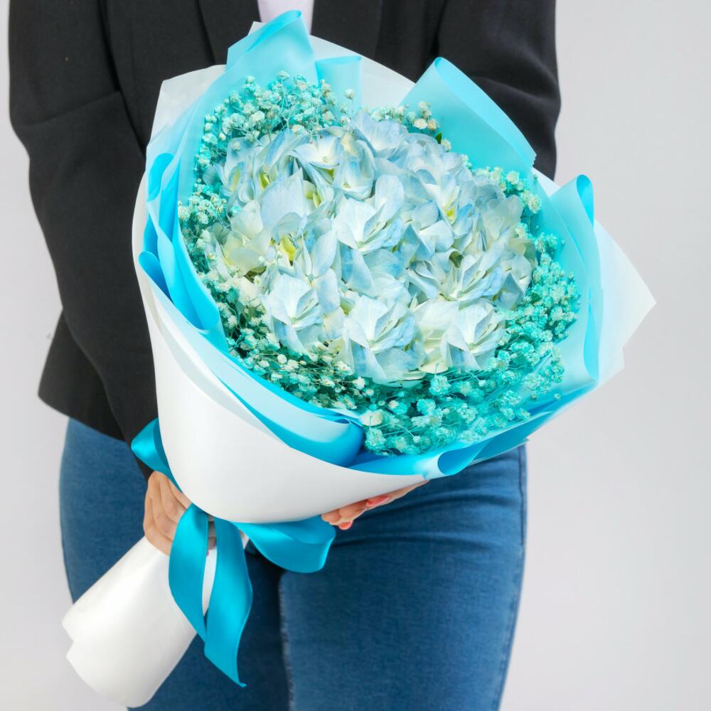 Гипсофила – 3 шт. Гортензия – 1 шт. Лента атласная – 1 шт. Дизайнерская упаковка – 2 шт.