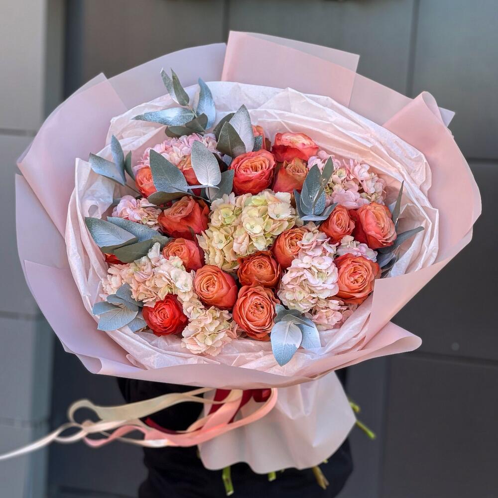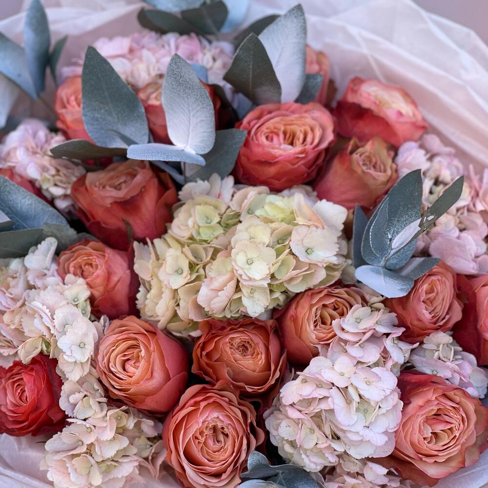 Букет из гортензии с розами кахала
