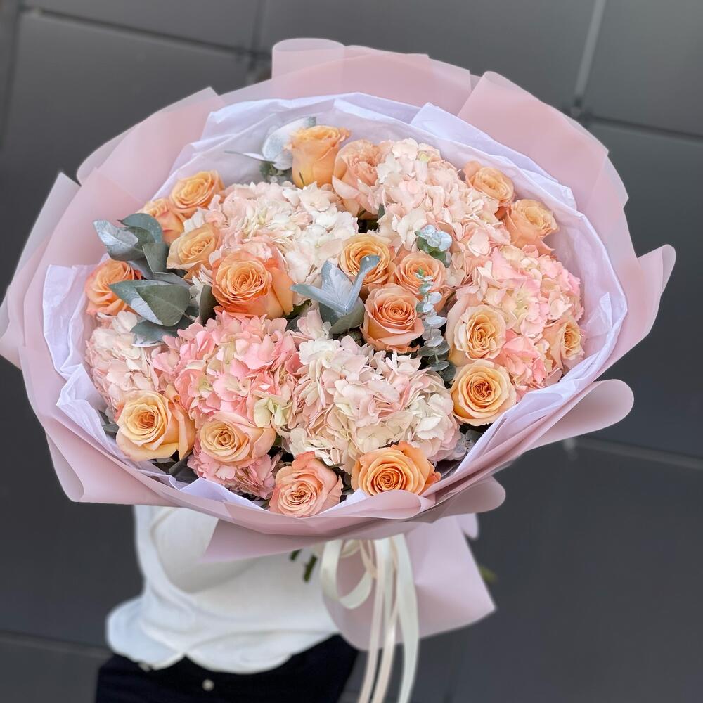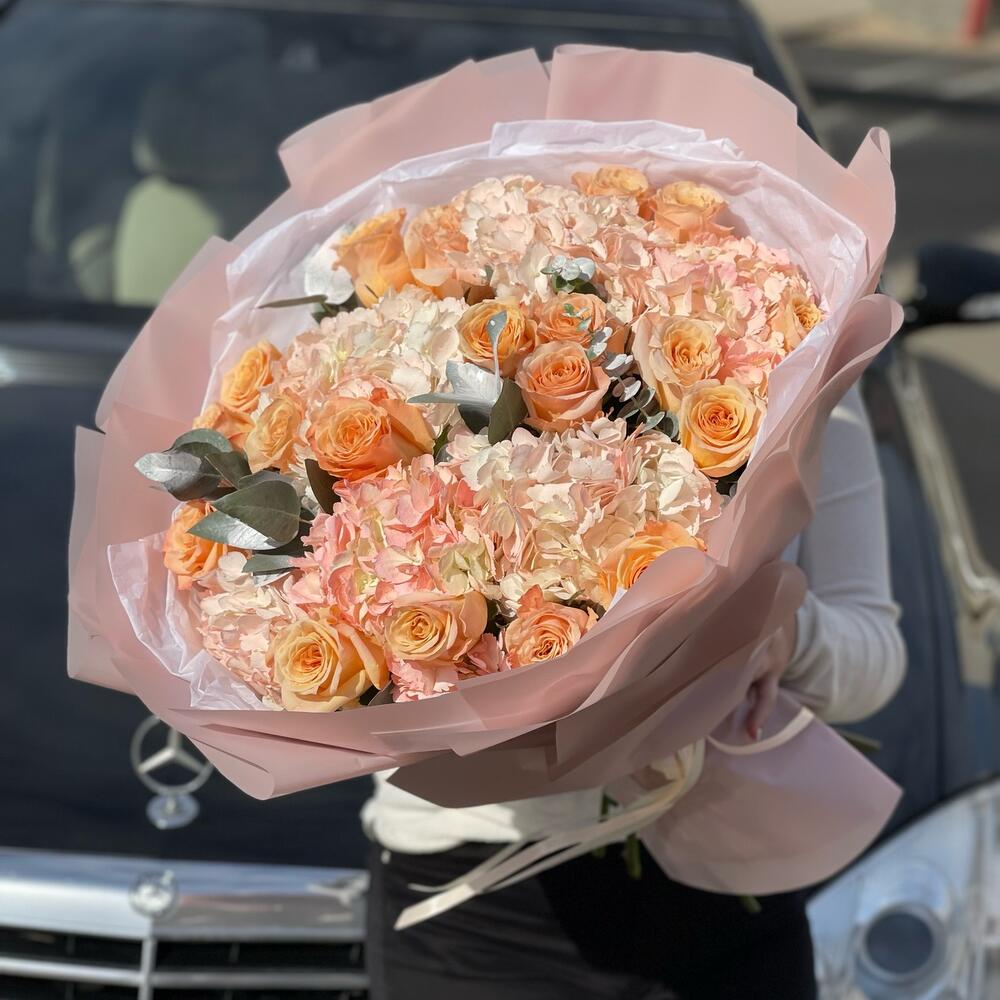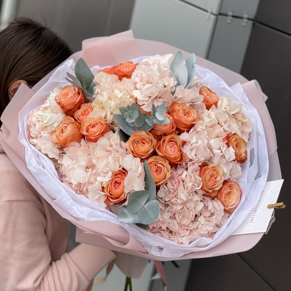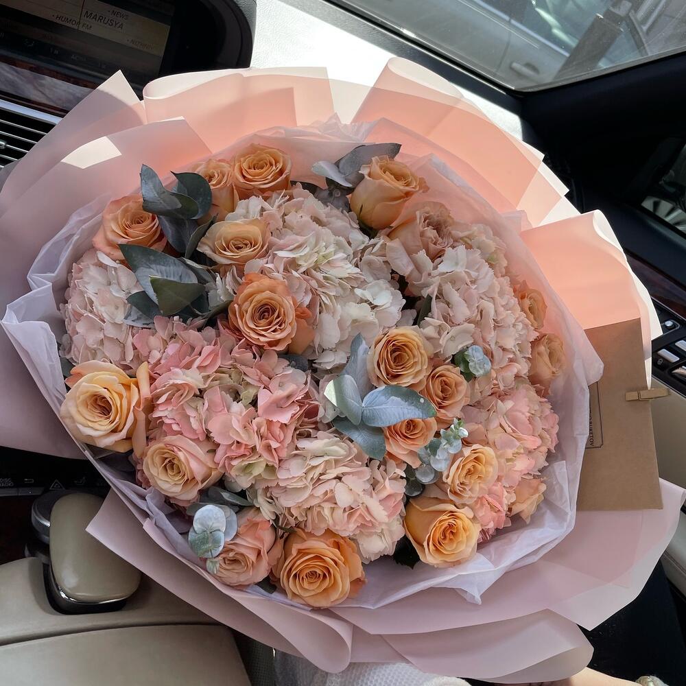 Пышный авторский букет с гортензиями и пионовидными розами сорта кахала ❤️Используем только качественные и свежие цветы 👍🏻Доставляем вовремя 😉