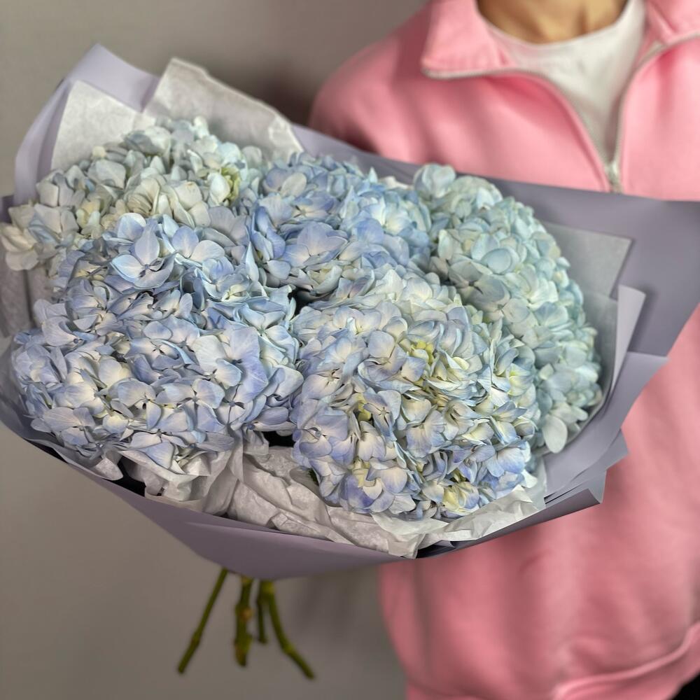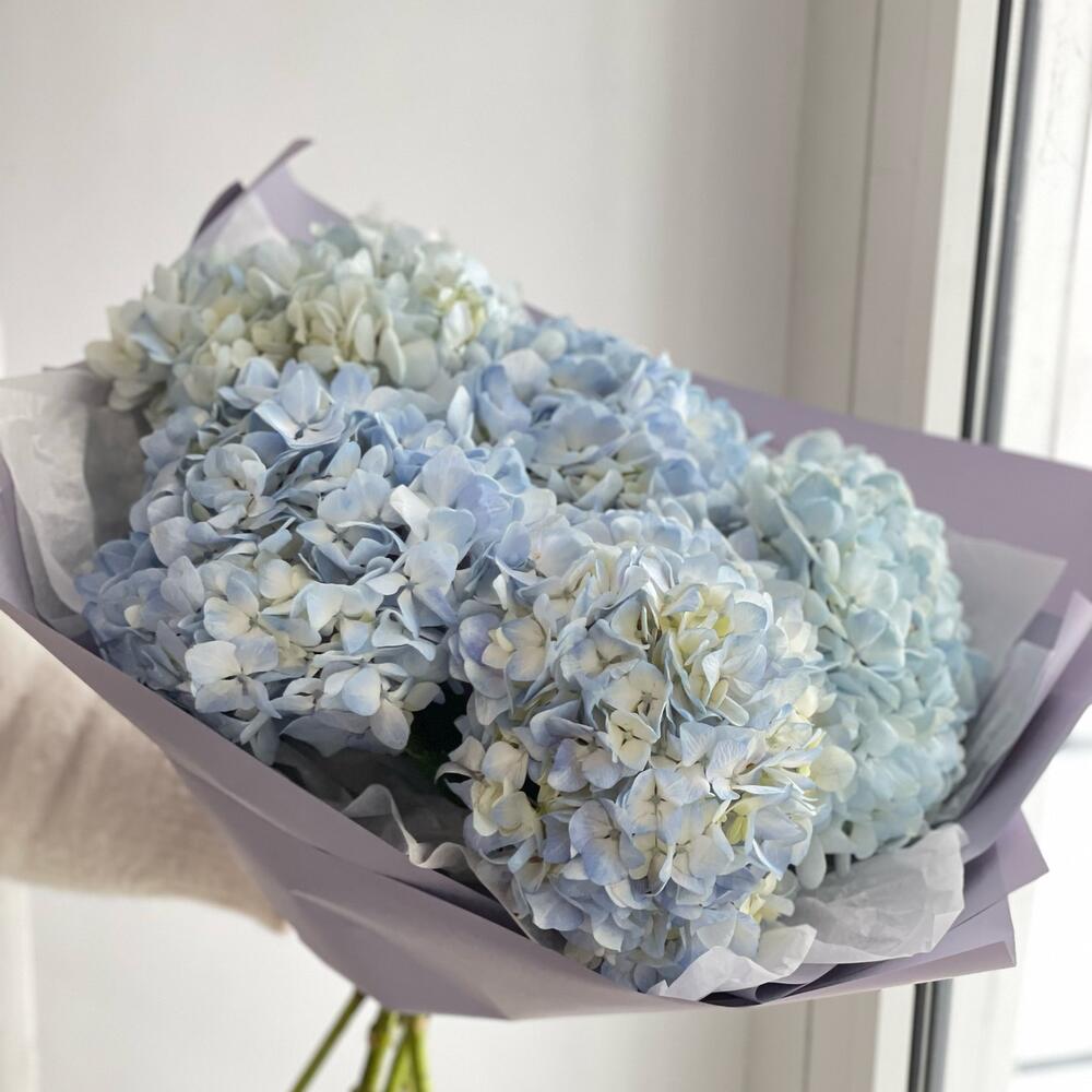Гортензия – 5 шт. Упаковка дизайнерская – 1 шт. Средство для продления жизни цветов – 1 шт.