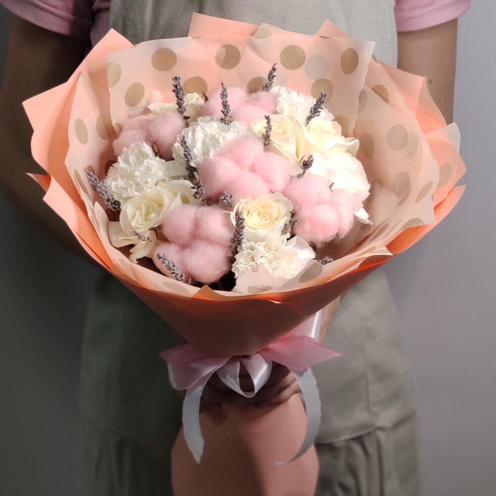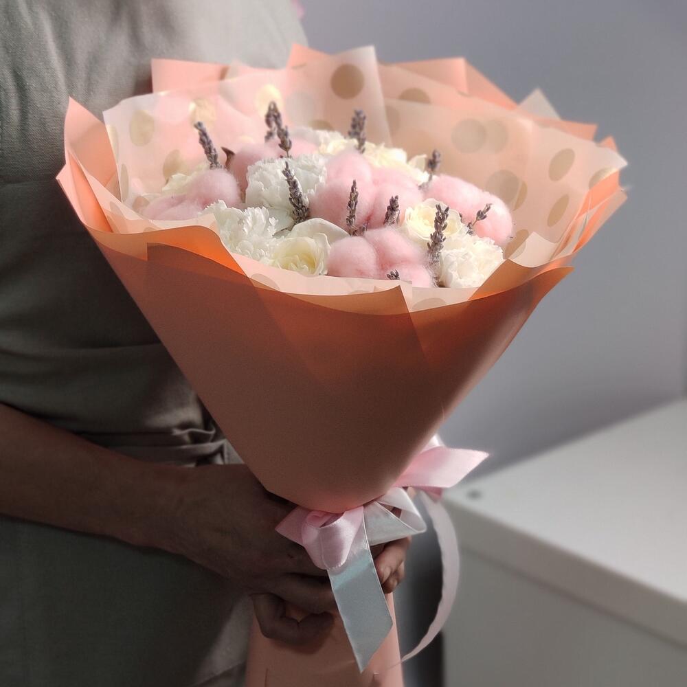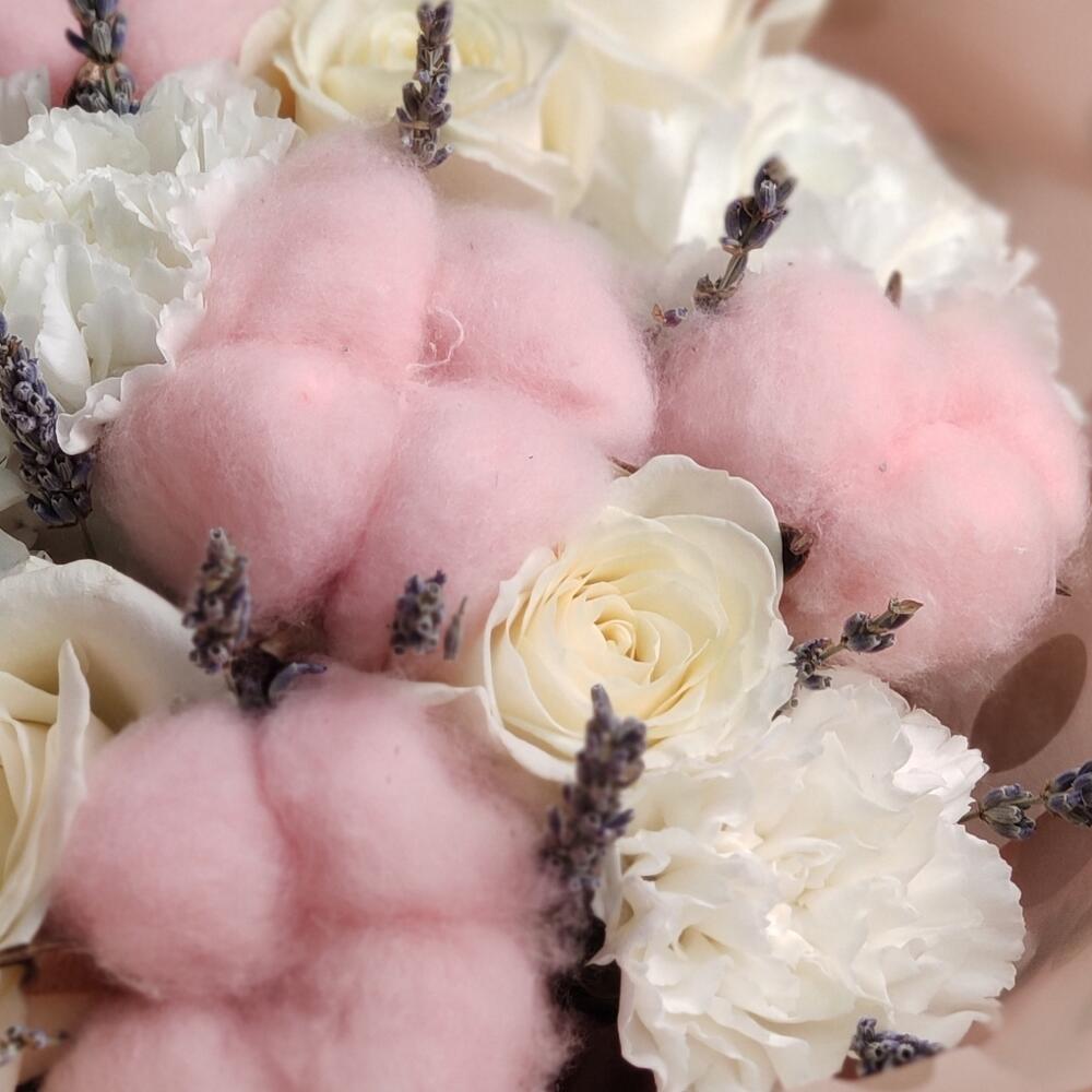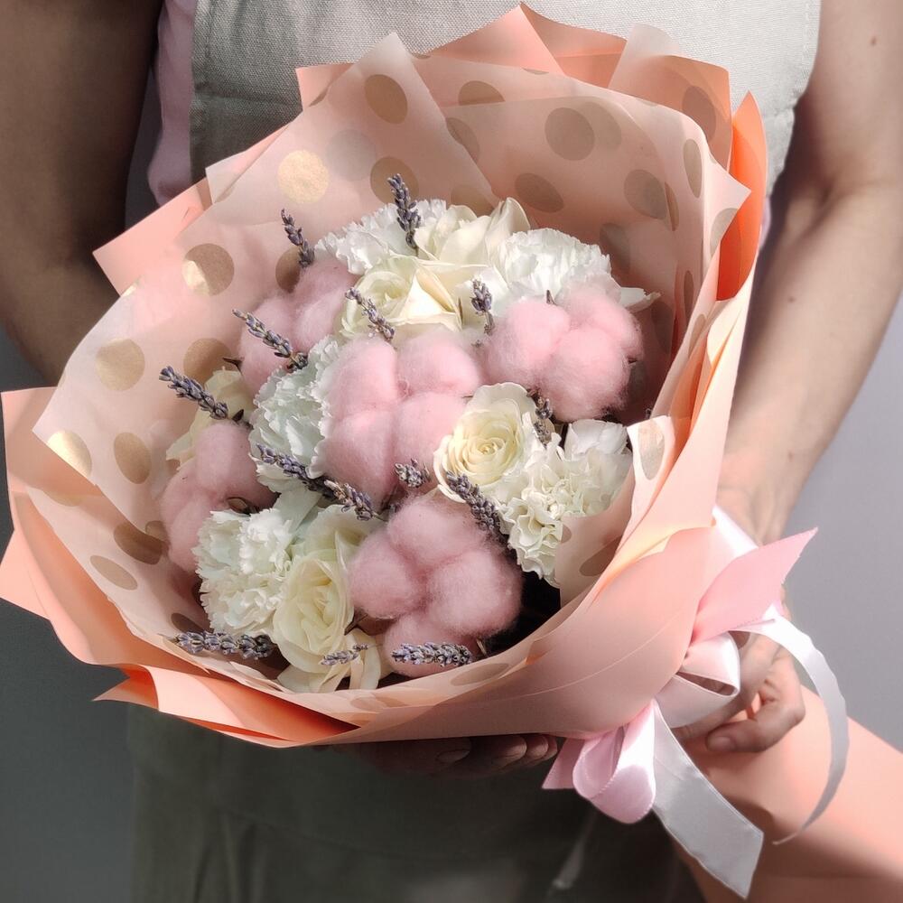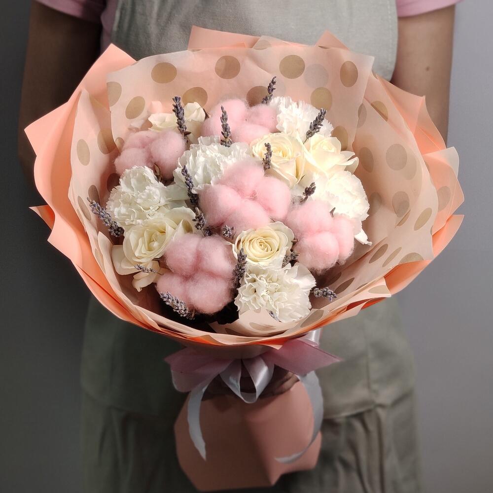 Букет из стойких цветов и хлопка, с добавлением лаванды в персиковых оттенках. Подойдёт для мамы, бабушки, ребёнка. К букеты вы можете дополнительно заказ шары, конфеты, игрушки, наборы косметики. Всё это вы найдете на странице нашего магазина.