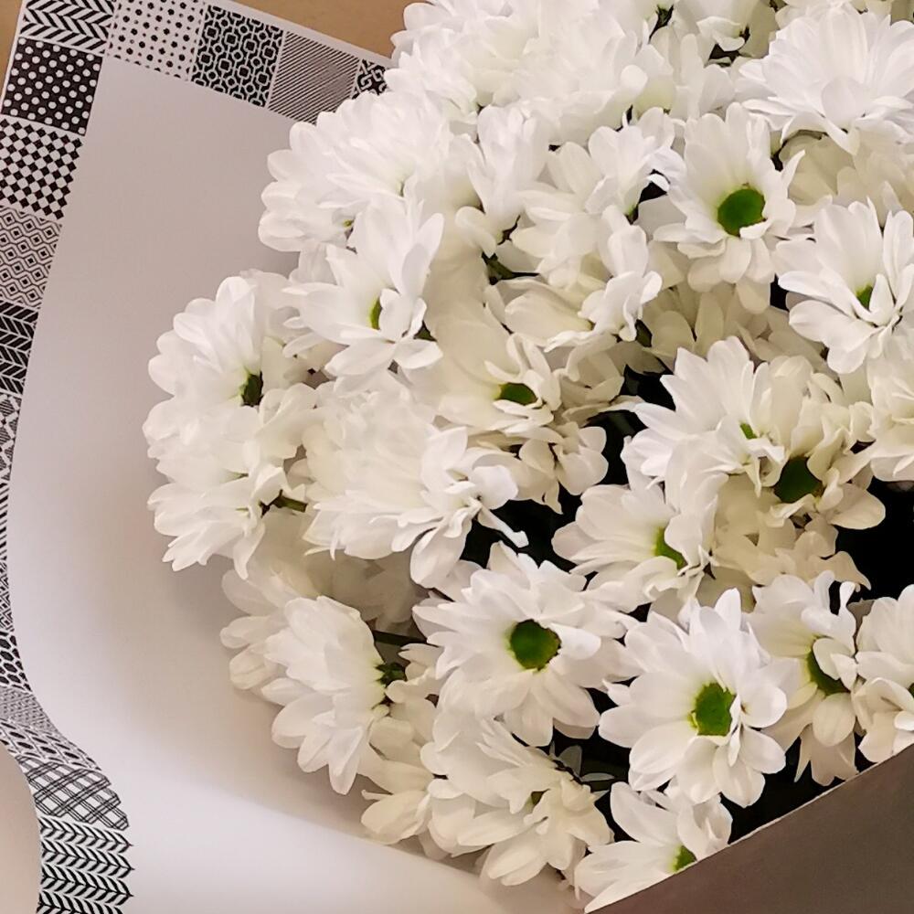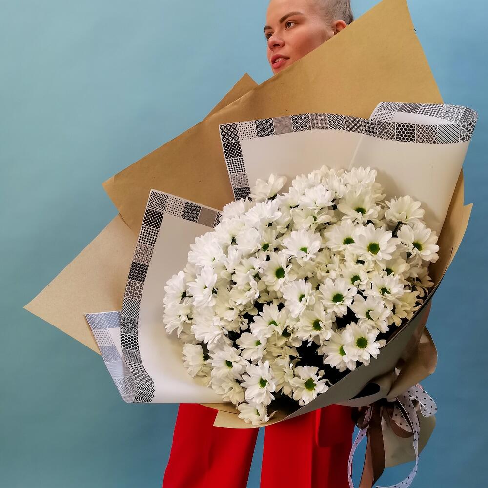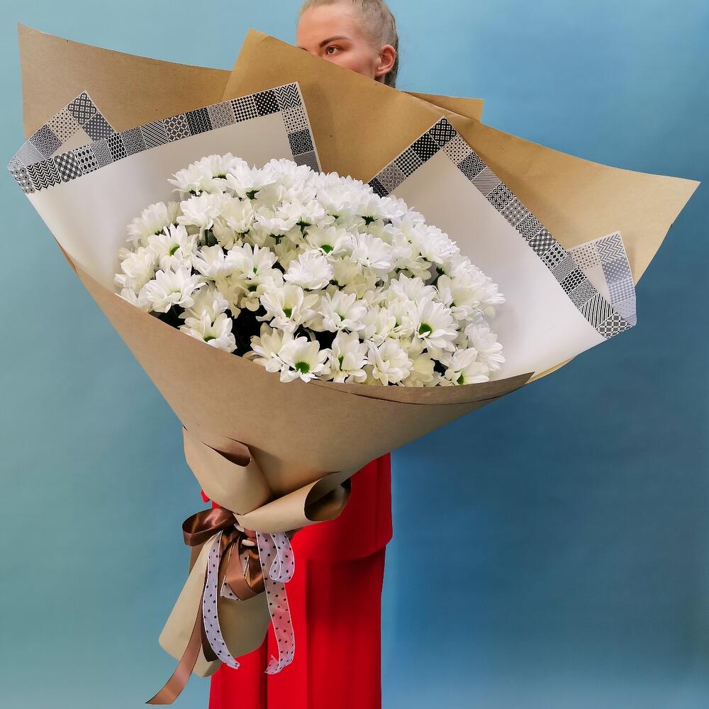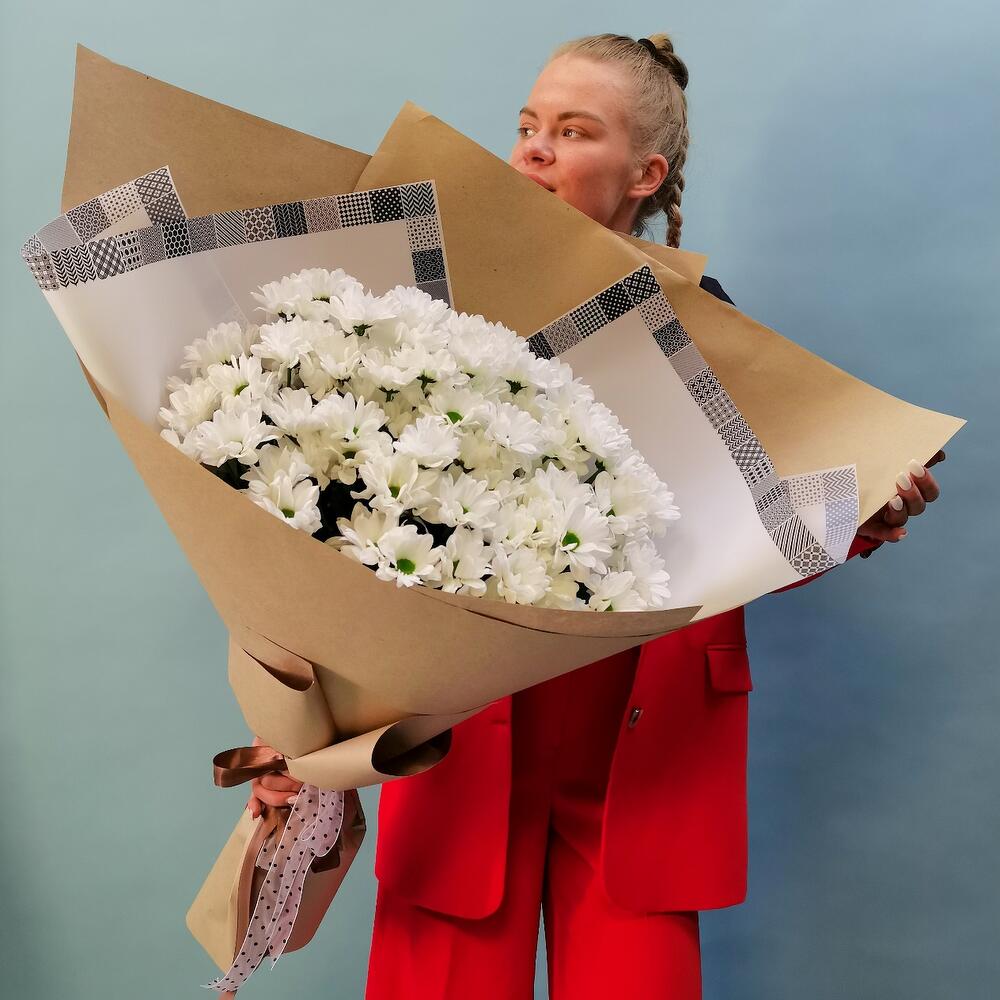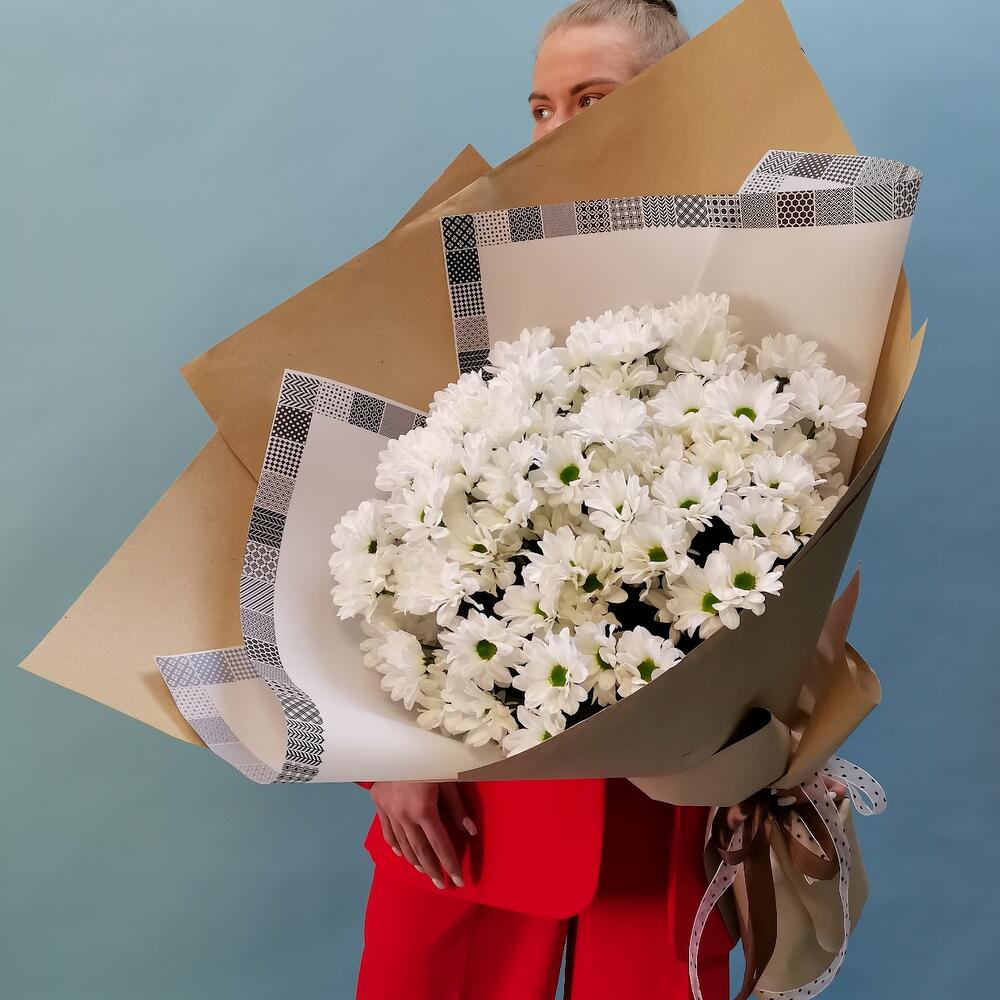 Хризантема кустовая – 15 шт. Лента атласная – 1 шт. бумага крафт – 3 шт. пленка декоративная – 2 шт.