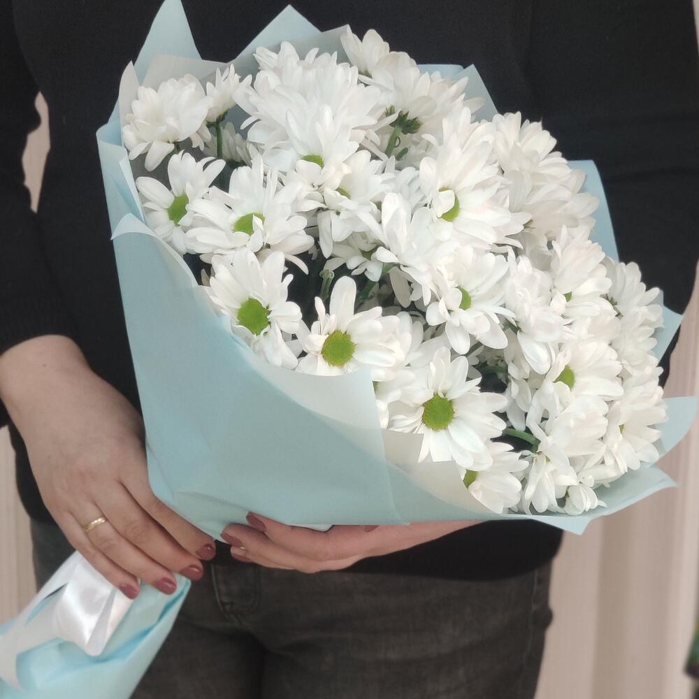Хризантема кустовая - 7 шт. Лента атласная - 1 шт. пленка голубая - 2 шт.
