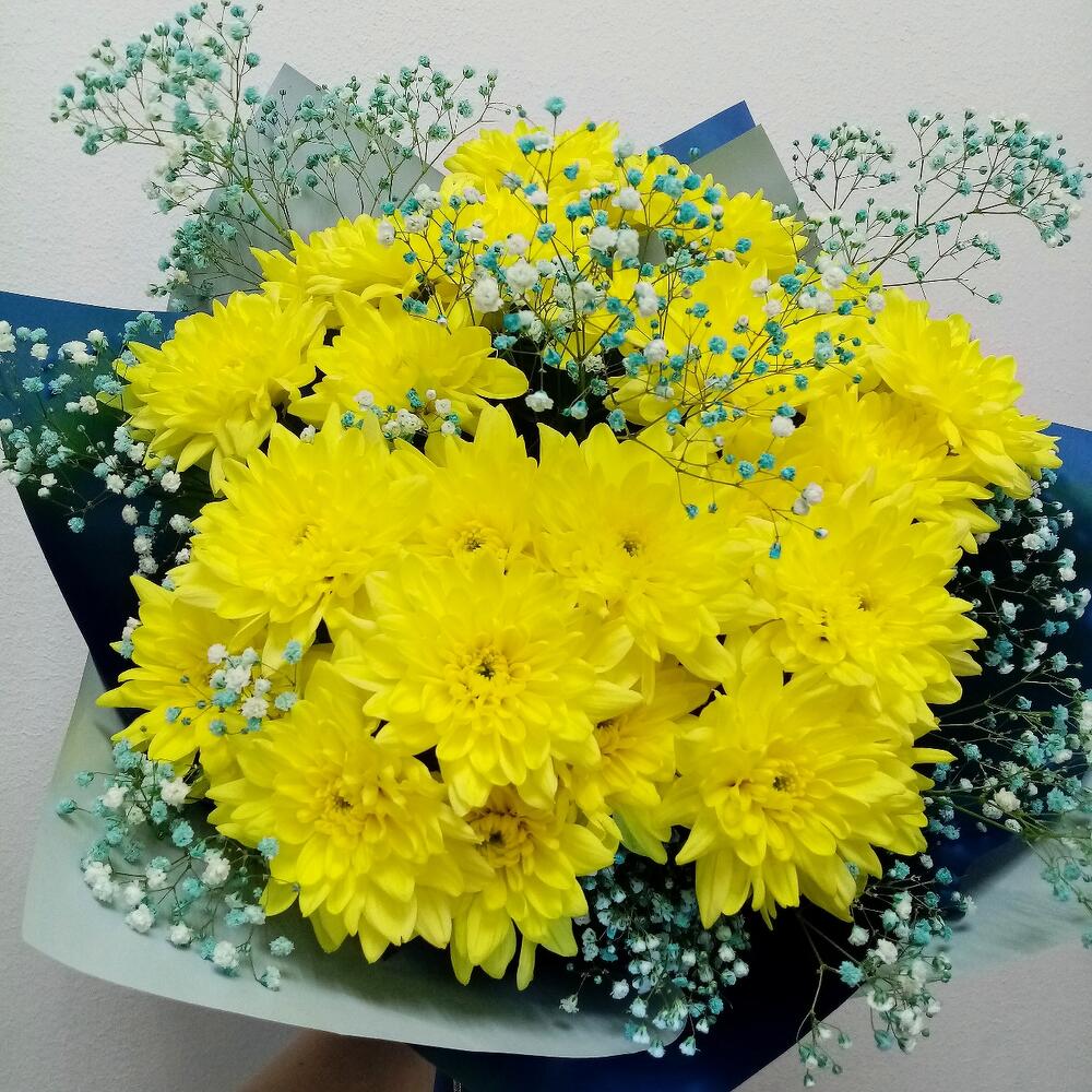 Гипсофила - 2 шт. Лента - 1 шт. Хризантема кустовая - 5 шт. Пленка матовая - 2 шт.
