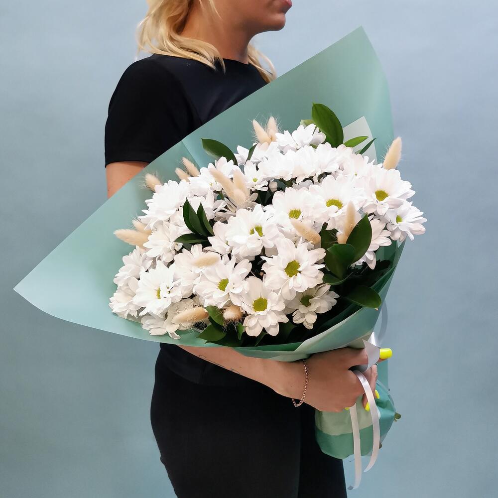 Рускус - 5 шт. Хризантема кустовая - 5 шт. Лента атласная - 1 шт. Лагурус - 3 шт. Пленка матовая - 2 шт.