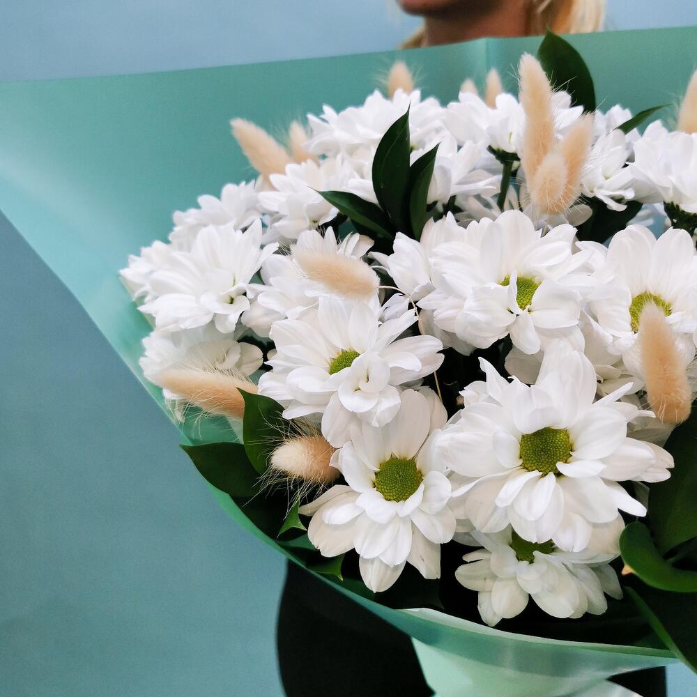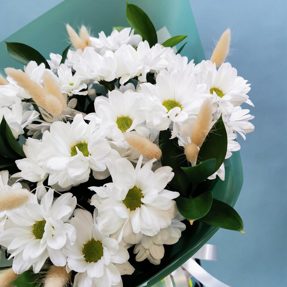 Рускус – 5 шт. Хризантема кустовая – 5 шт. Лента атласная – 1 шт. Лагурус – 3 шт. Пленка матовая – 2 шт.