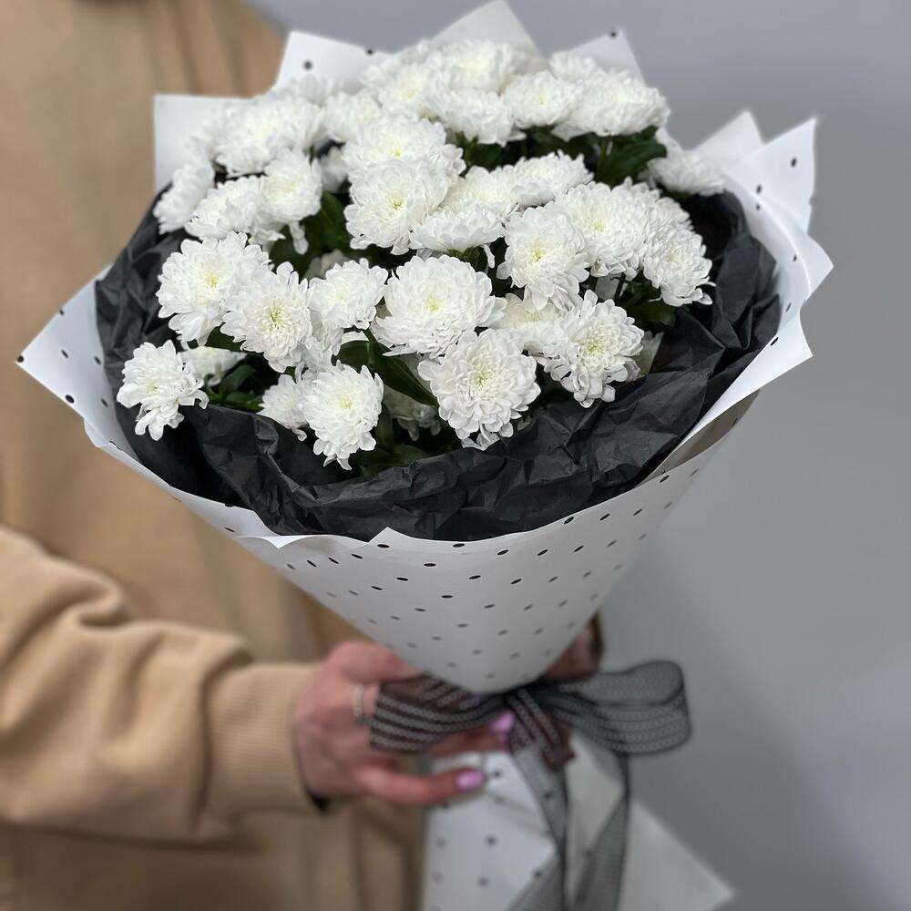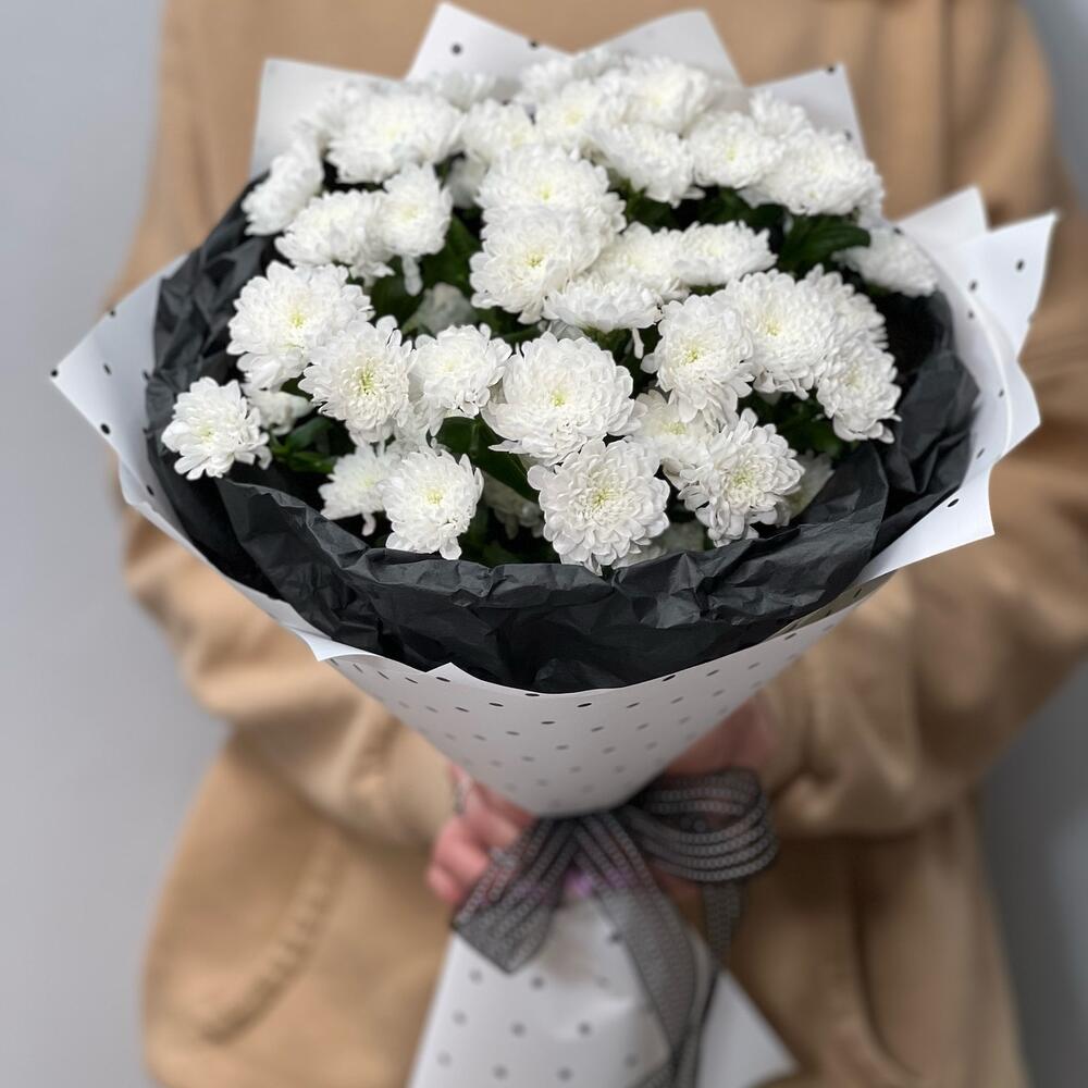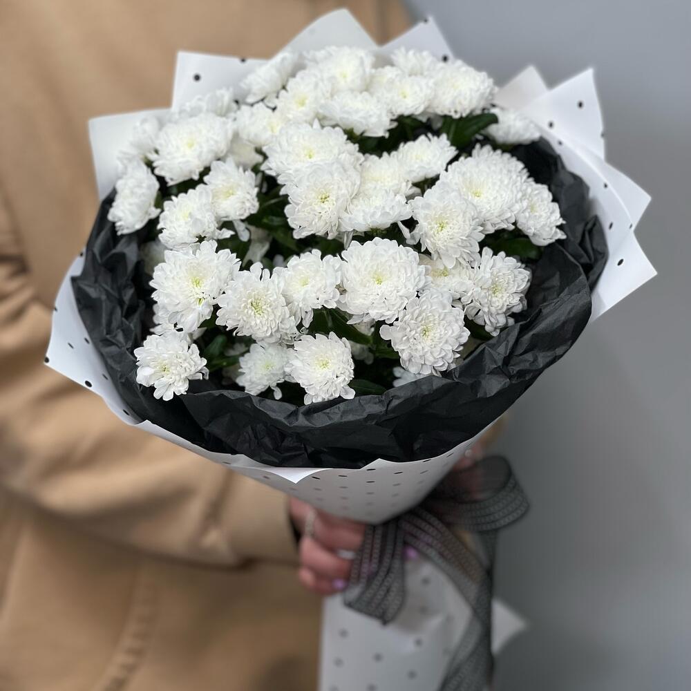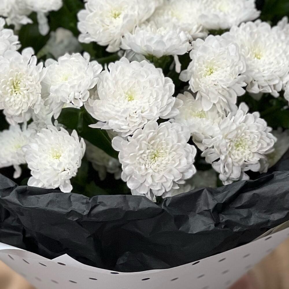 Стильный букет из сотовых кустовых хризантем в изысканном оформлении с черным тишью Кустовая хризантема обладает особой стойкостью и очарованием за счет своей воздушной фактуры Букет из белых хризантем можно заказать на доставку в Нижнем Новгороде Открытка с Вашими пожеланиями абсолютно бесплатно