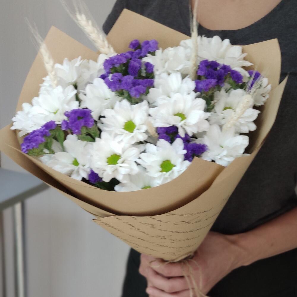 Колосья – 5 шт. Статица синяя – 2 шт. Крафт упаковка – 1 шт. Хризантема Кустовая Бакарди белая – 3 шт. бечевка натуральная – 1 шт.