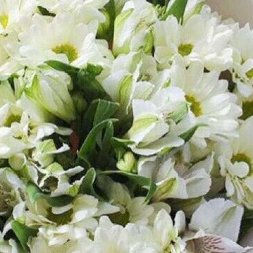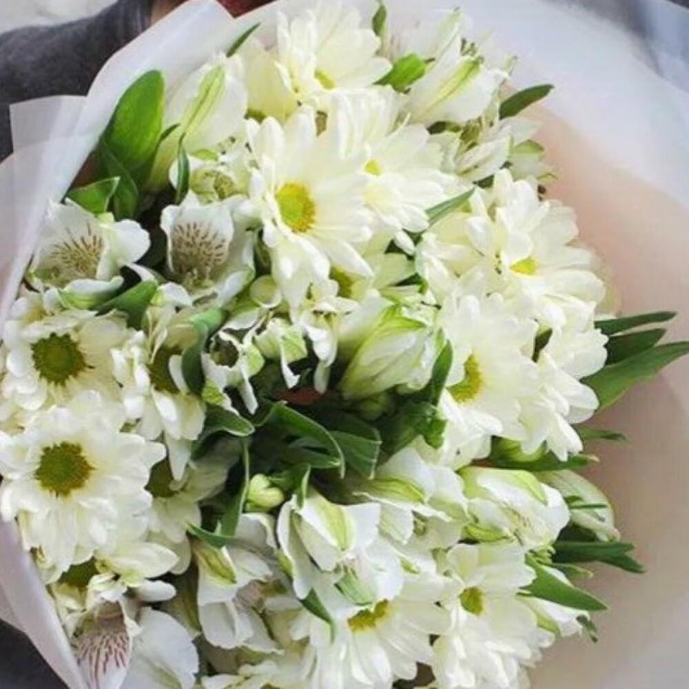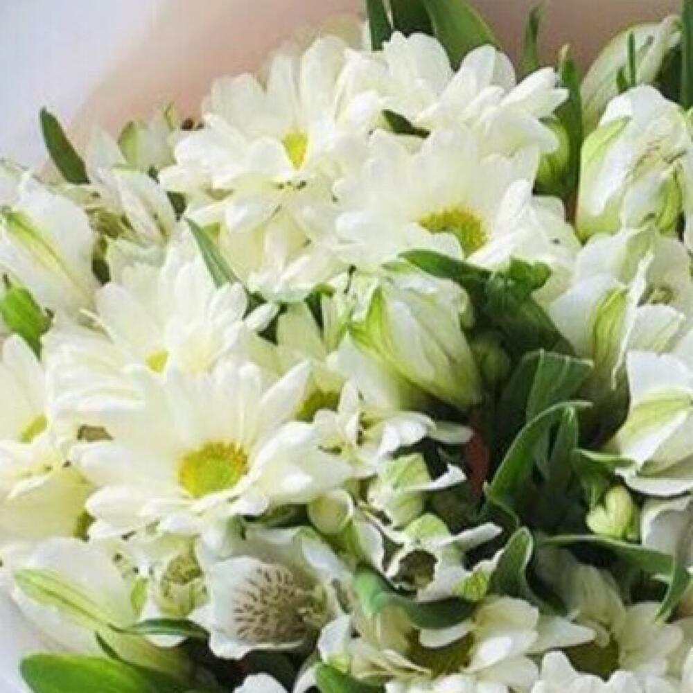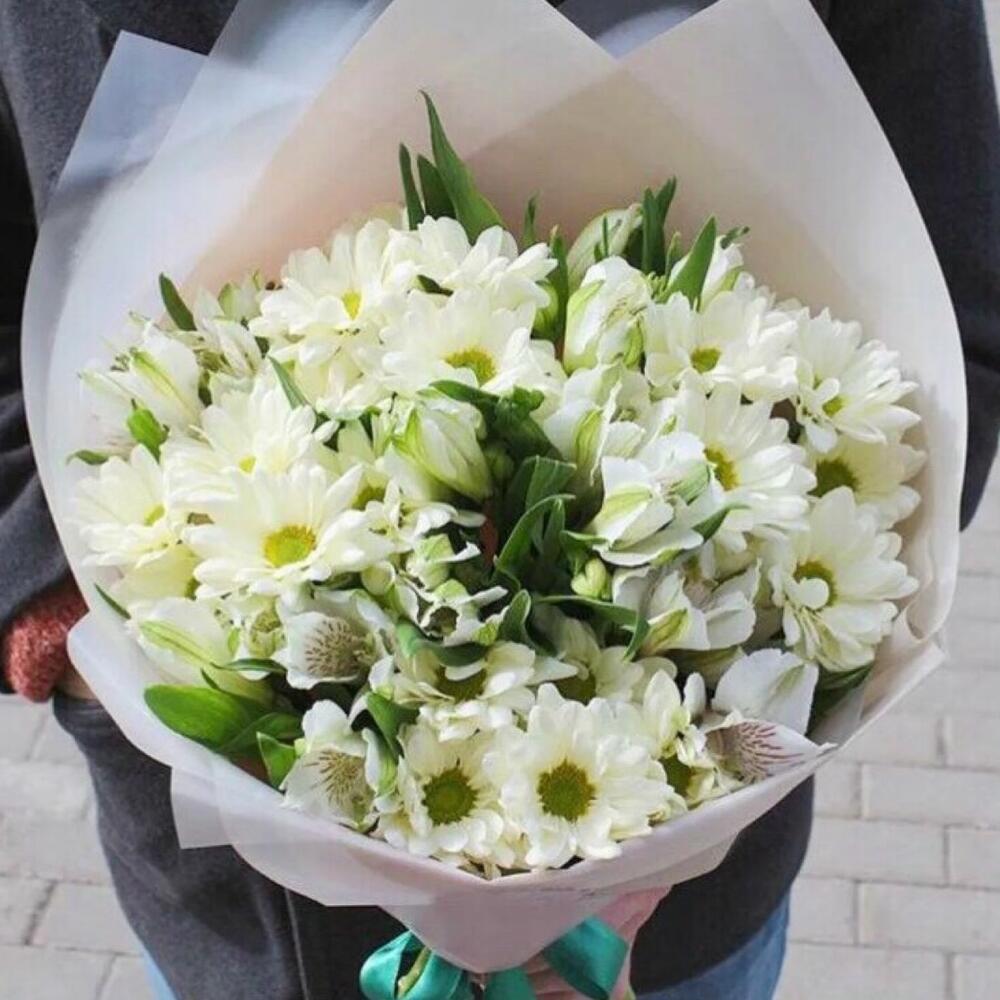 Букет из белых ромашковых хризантем и альстромерии в красивой упаковке . Объемный , но в то же время легкий букет прекрасный подарок для коллеги , врача , учителя !