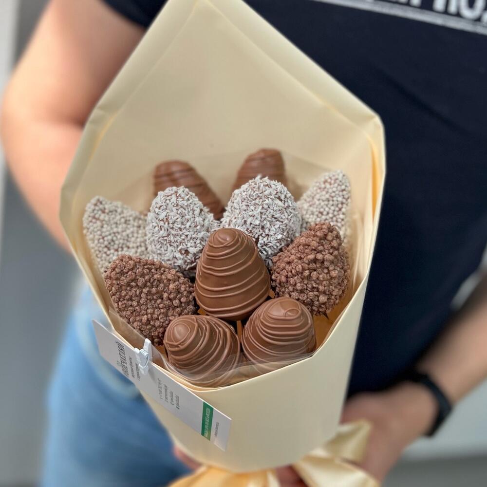 Клубника - 250 гр. Упаковка - 1 шт. Лента атласная - 1 шт. шоколад молочный бельгия callebaut - 50 гр.