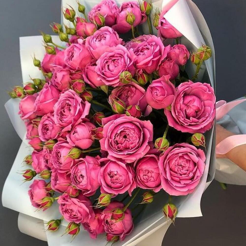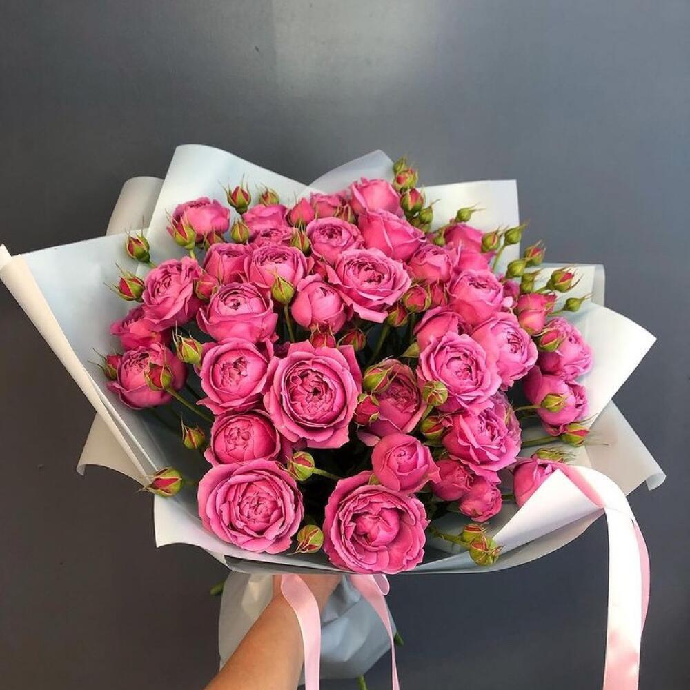 Лента атласная - 2 шт. Роза кустовая пионовидная - 7 шт. Упаковка дизайнерская - 4 шт.
