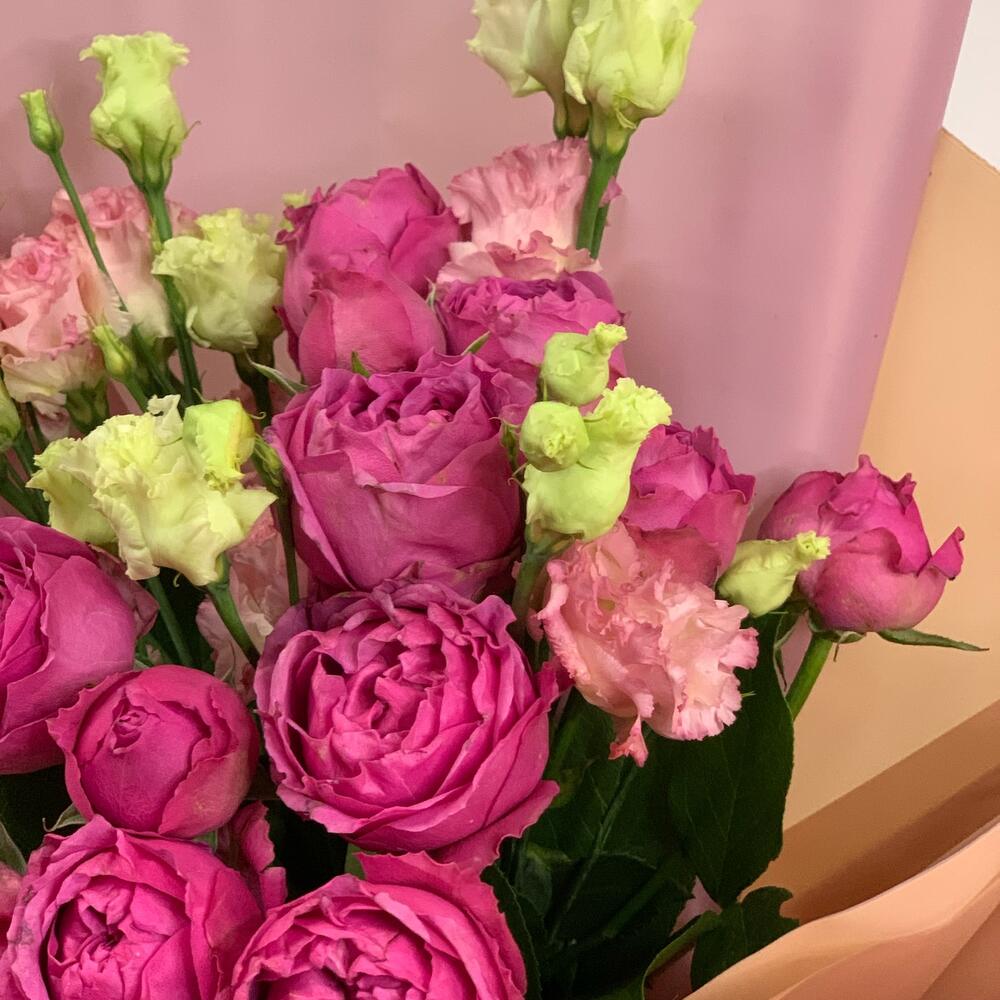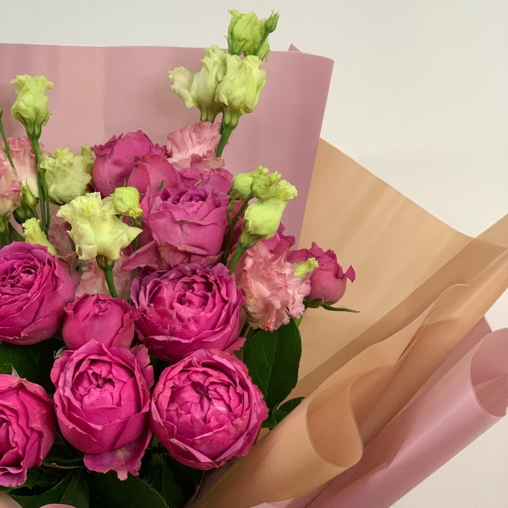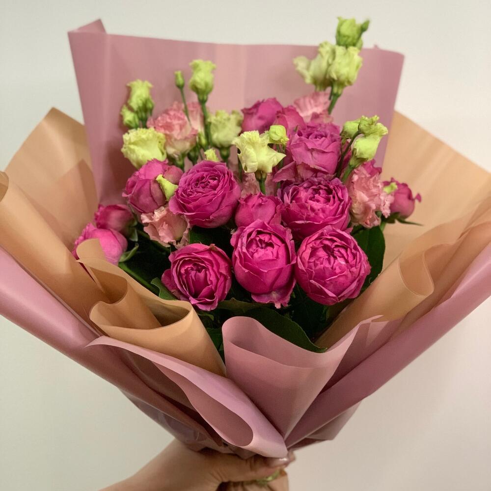 Букет из кустовых пионовидных роз и эустомы