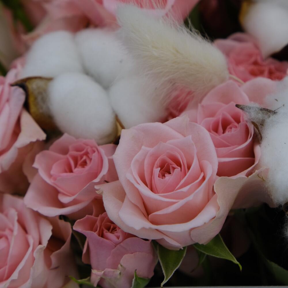 Роза кустовая - 9 шт. Хлопок - 3 шт. Упаковка дизайнерская - 1 шт. Лагурус - 7 шт.