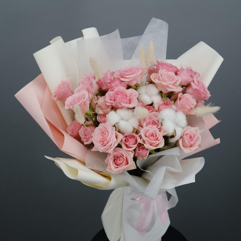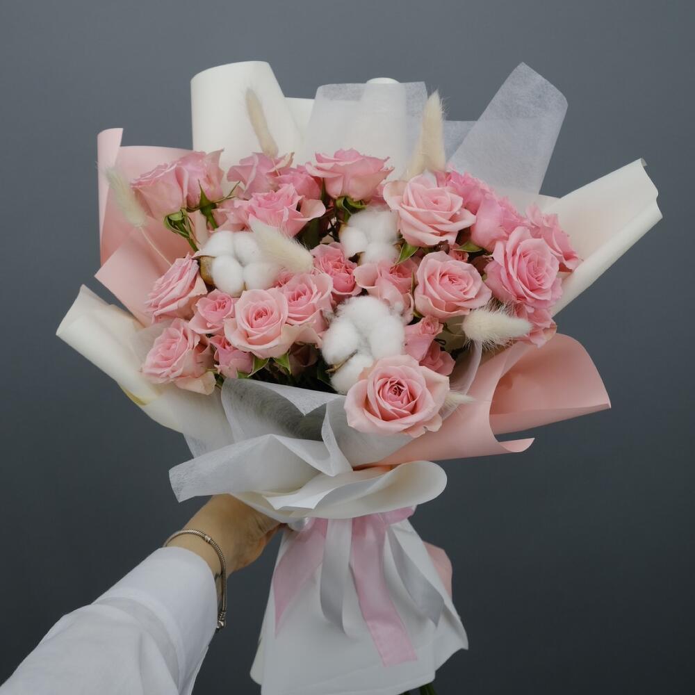 Нежный букет в корейской упаковке из розовых кустовых роз в сочетании с хлопком и лагурусом