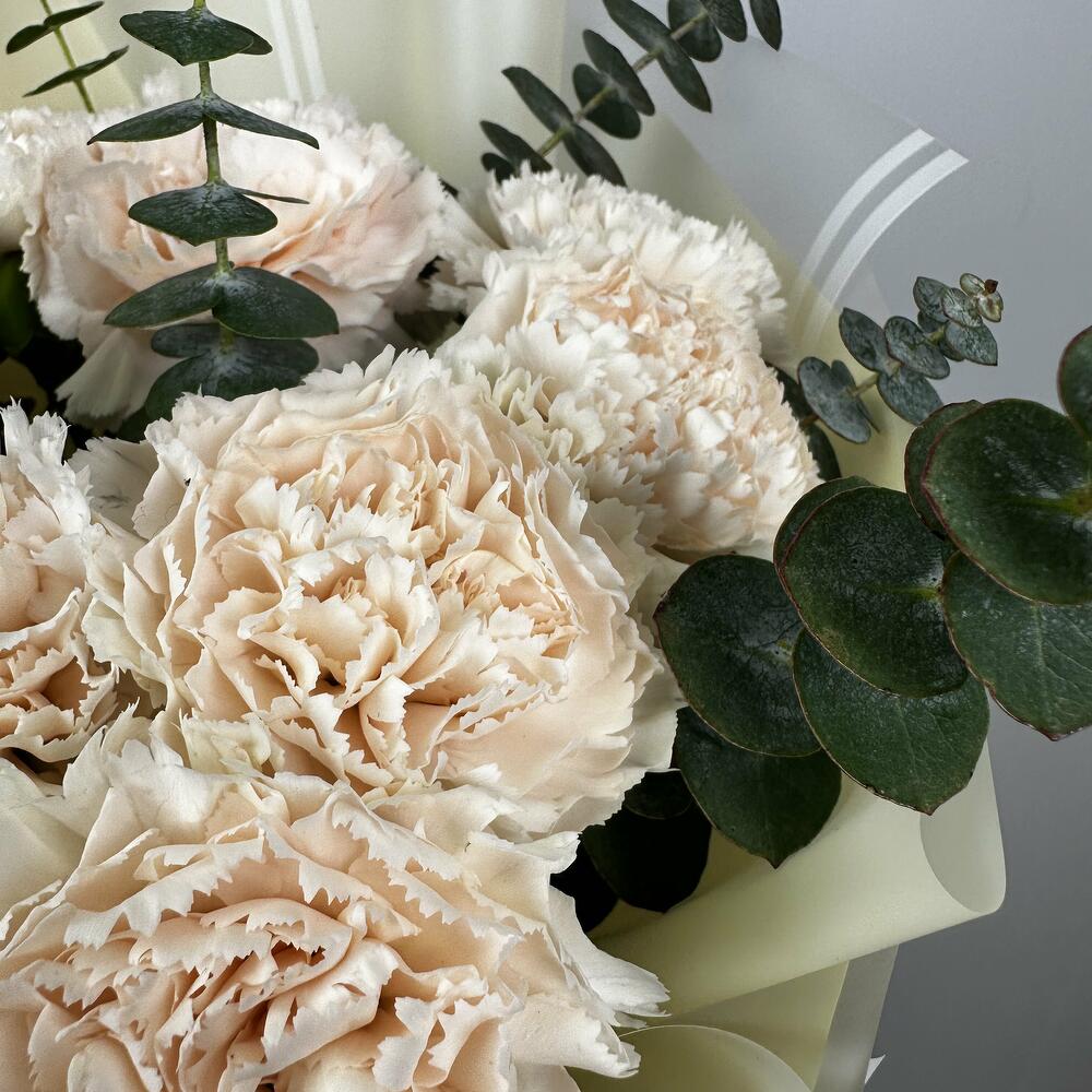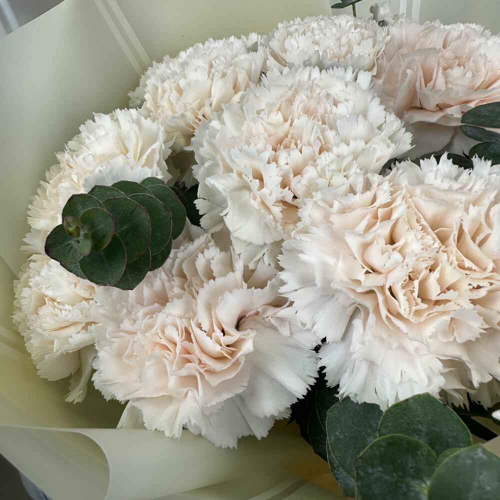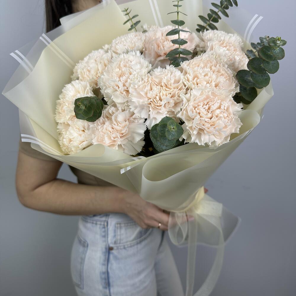 Эвкалипт - 7 шт. Лента атласная - 1 шт. Диантус - 15 шт. Дизайнерская упаковка - 1 шт.