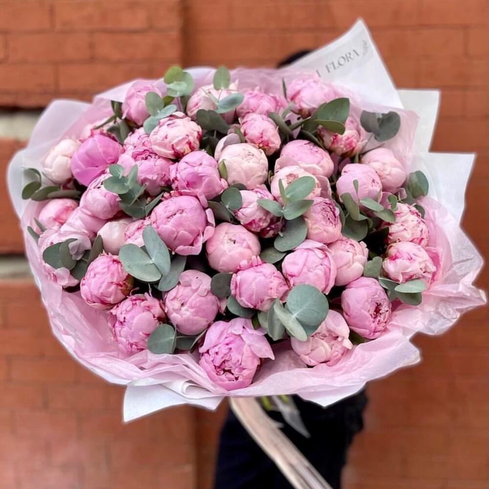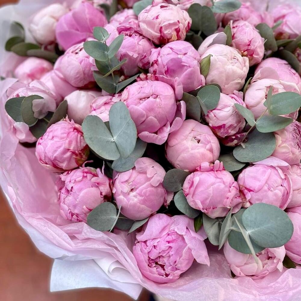 Лента – 1 шт. Эвкалипт – 6 шт. пионы – 51 шт. упаковка (фоамиран) – 3 шт.