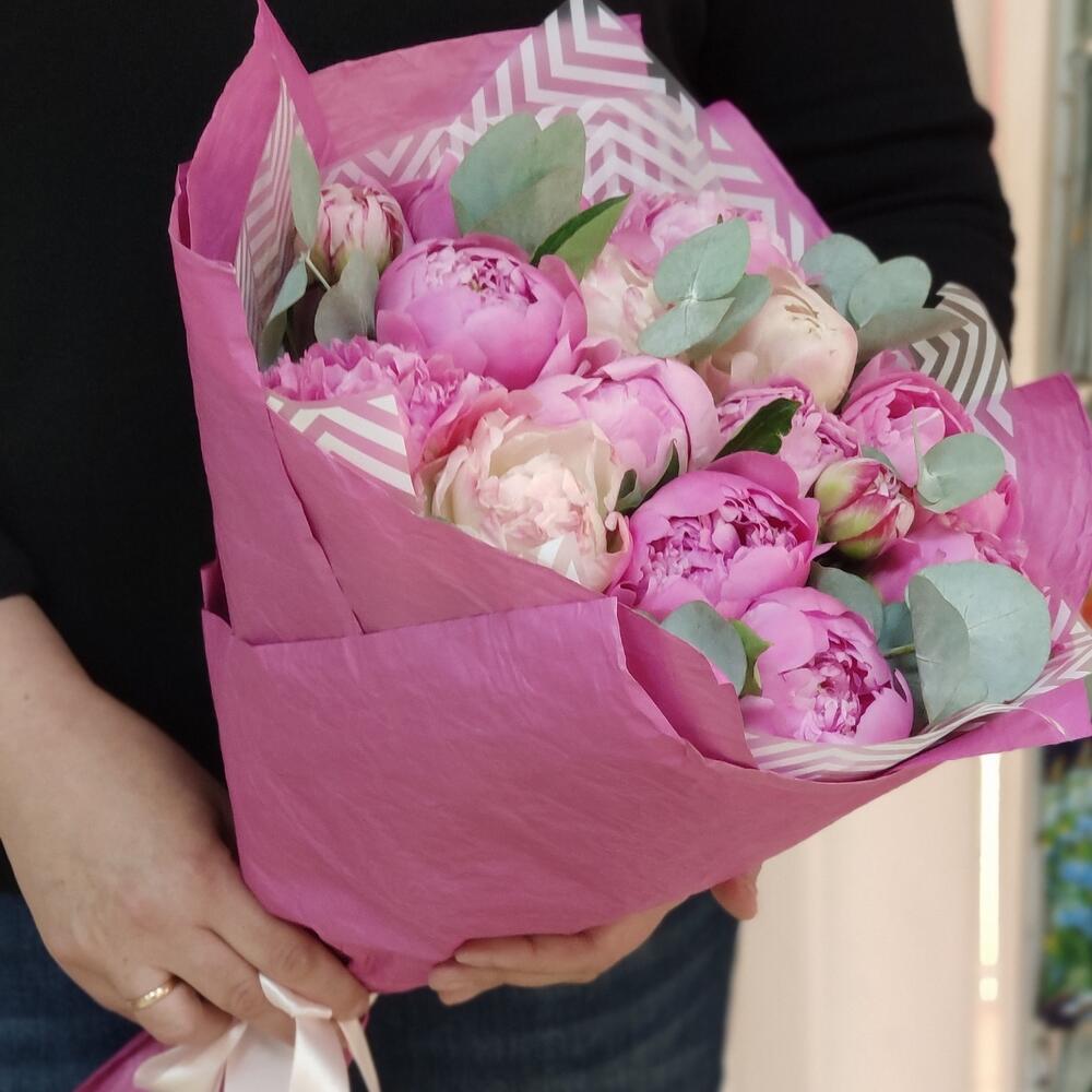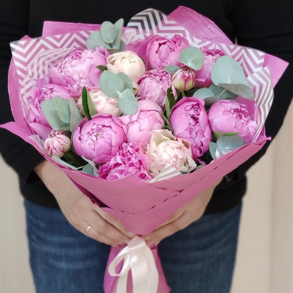 Эвкалипт – 5 шт. бумага дизайнерская – 1 шт. пленка матовая белая – 1 шт. пион микс сортовой – 15 шт.