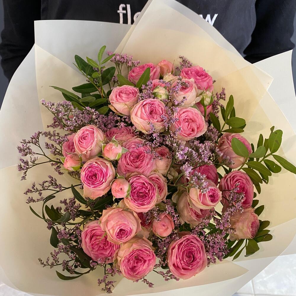 Букет из пионовидных кустовых роз и лимониума