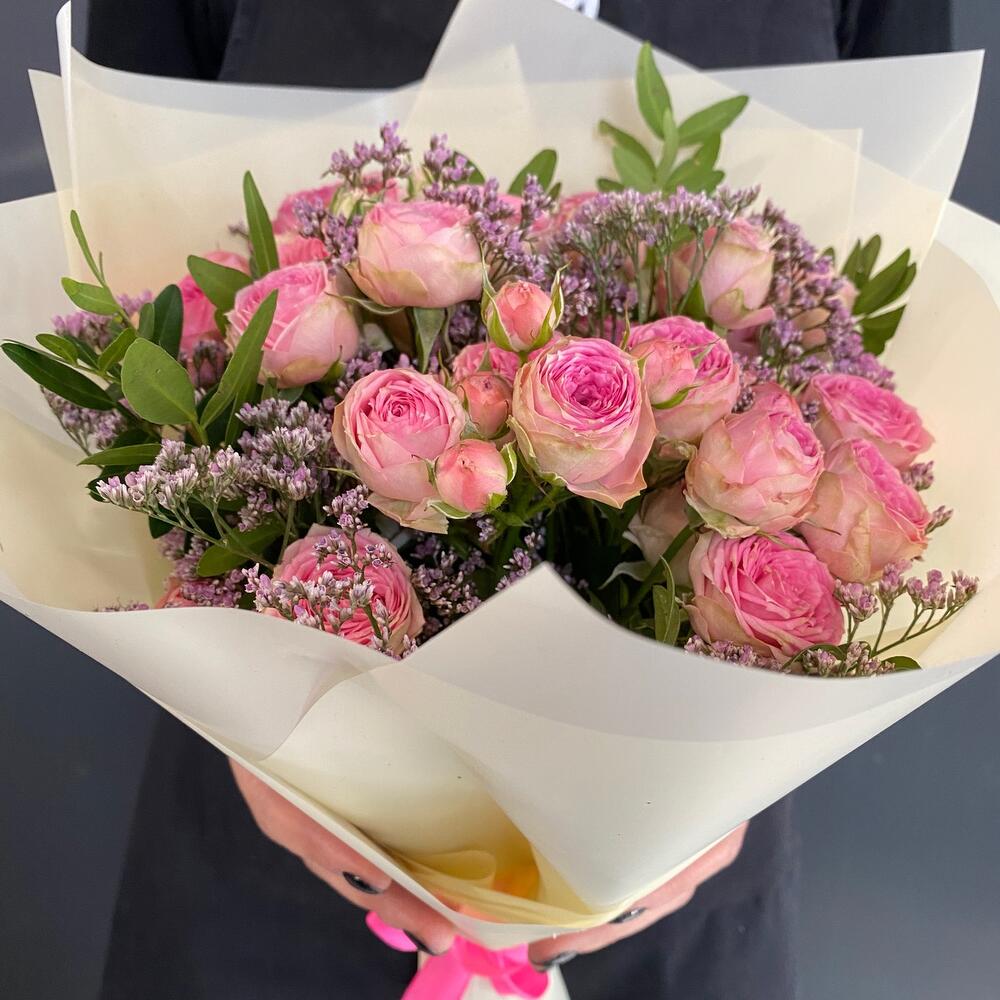 Нежный букет из пионовидной кустовой розы,воздушного лимониума и зелени,порадует ваших родных и близких.