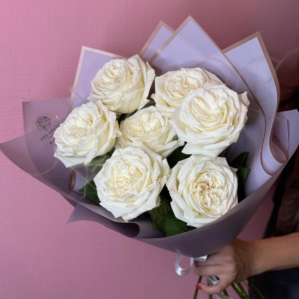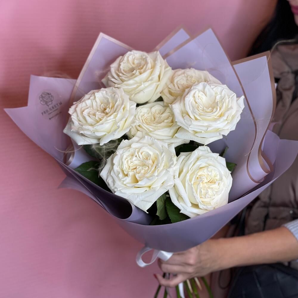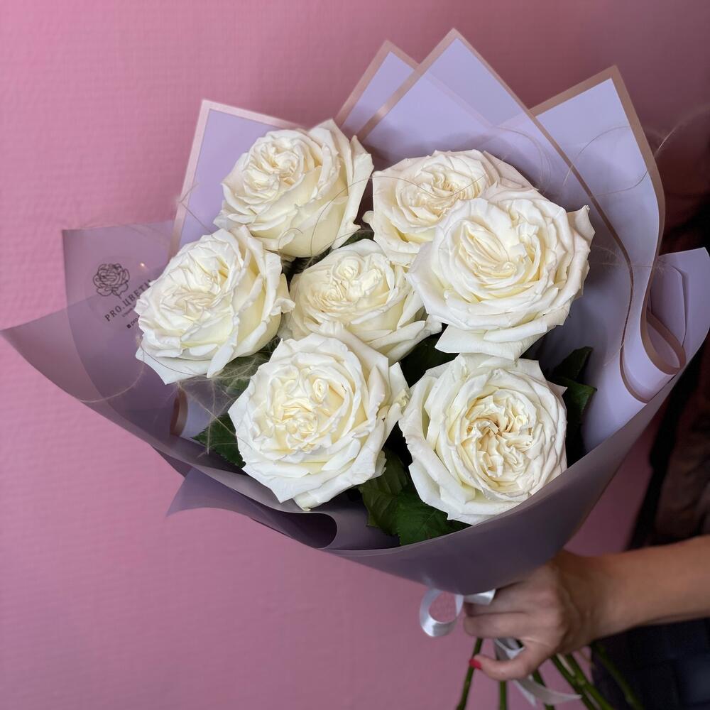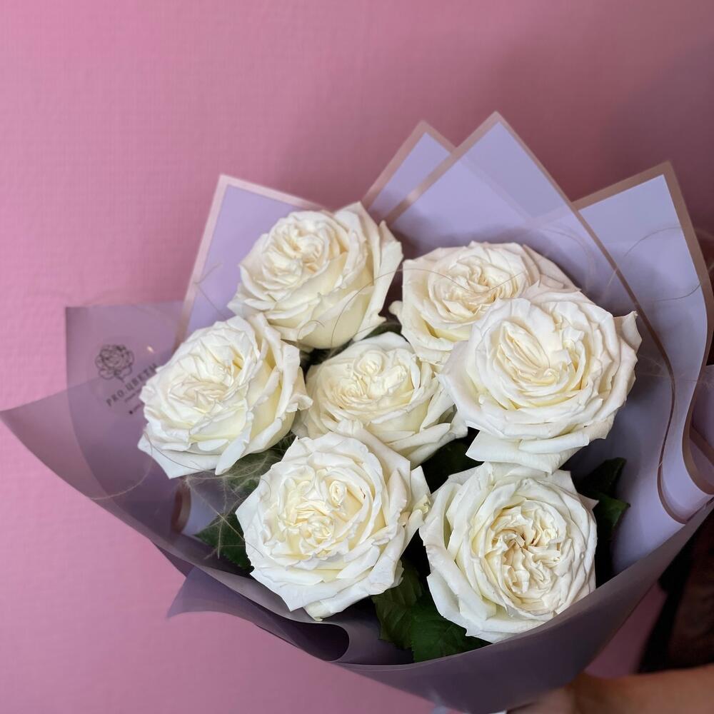 Лента атласная - 1 шт. Средство для продления жизни цветов - 1 шт. Стифа - 4 шт. Пленка дизайнерская - 1 шт. розы пионовидные - 7 шт.