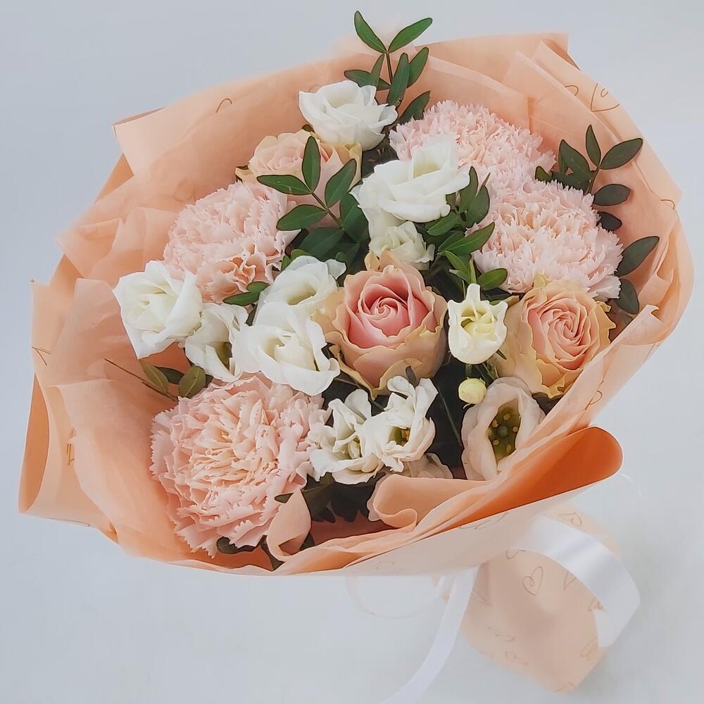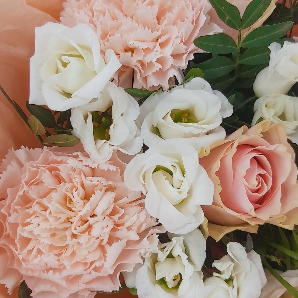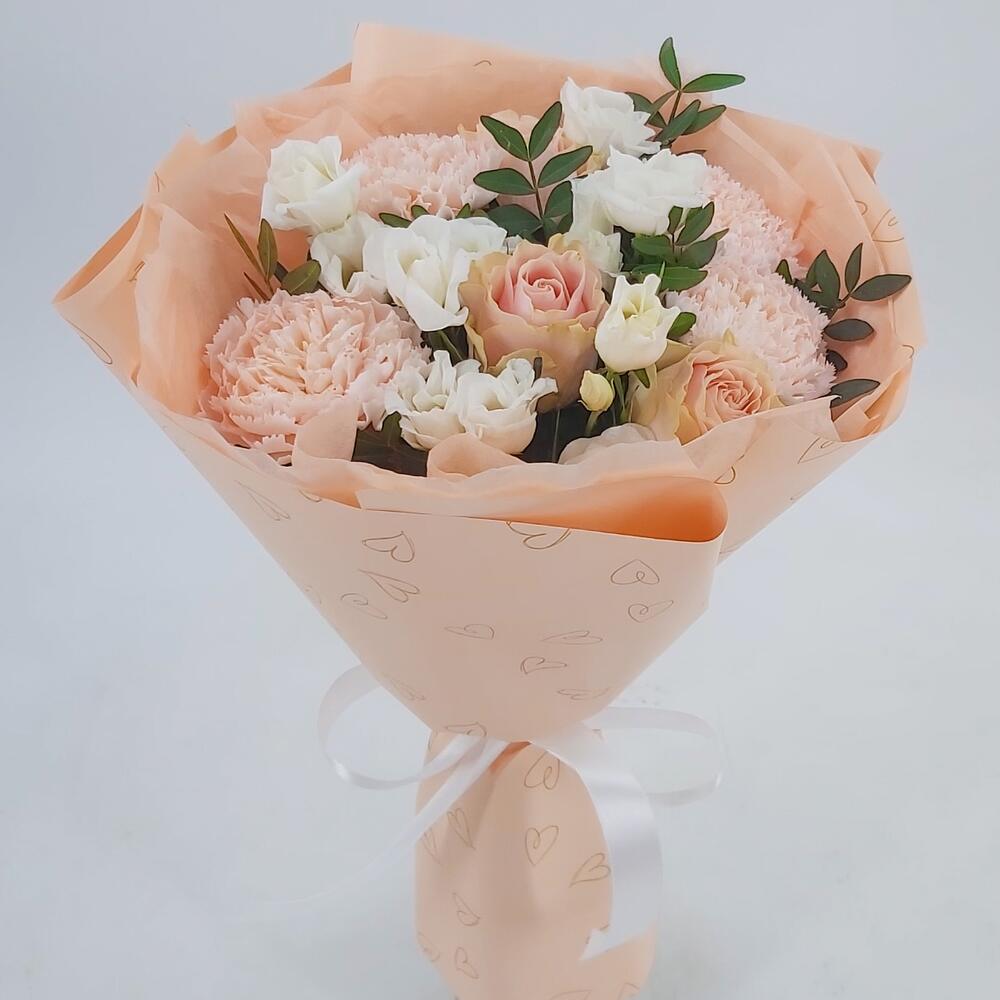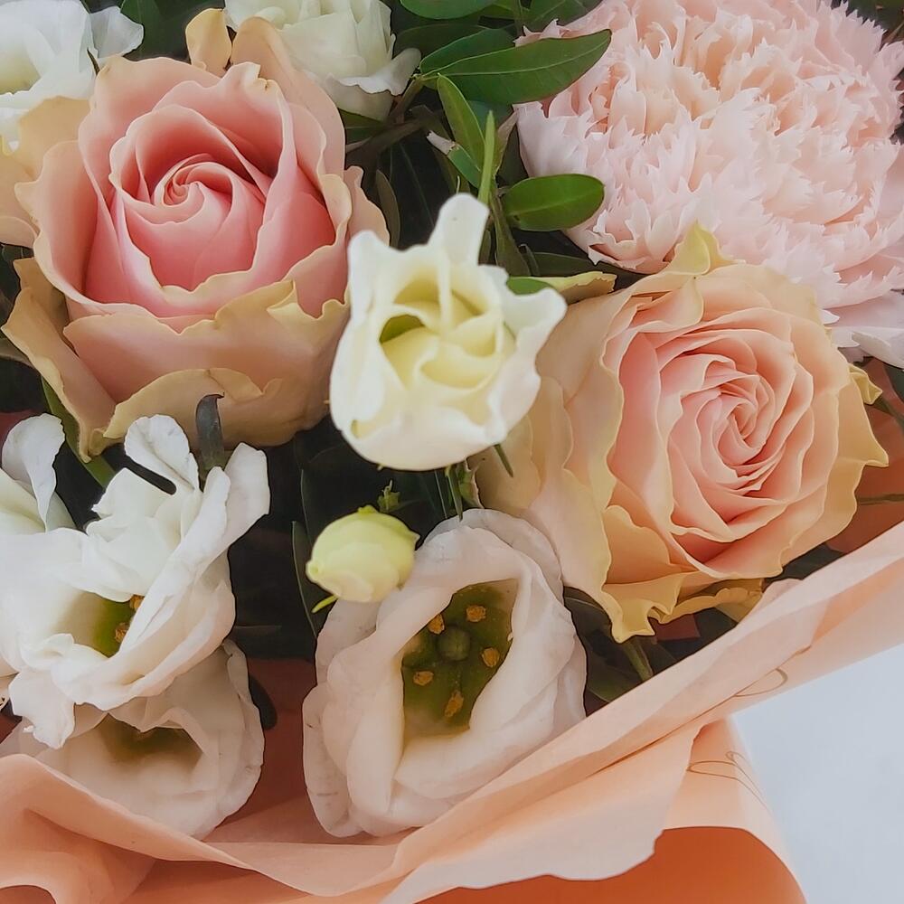 Нежный букет в персиково-белых тонах из роз, эустомы и диантусов. Такой букет всегда уместен и подойдёт для любого повода: День Рождения, именины, годовщина свадьбы, рождение ребенка, 8 марта, День Святого Валентина, выпускной и т.д. Можно вручить маме, сестре, подруге, коллеге, учителю, любимой.