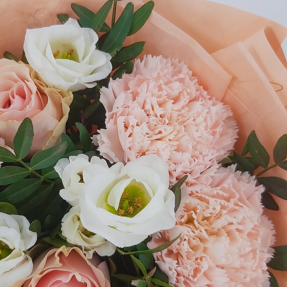Букет из роз, эустомы и гвоздик Пичи Лав