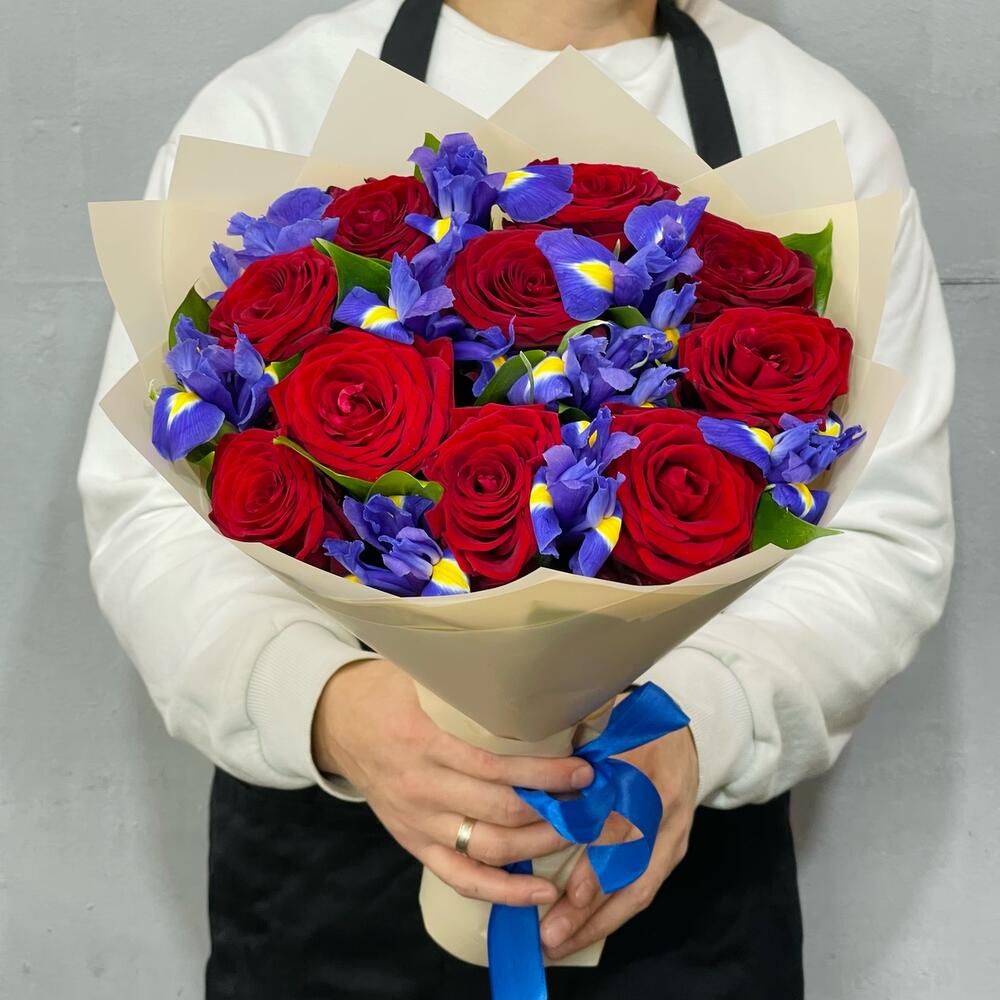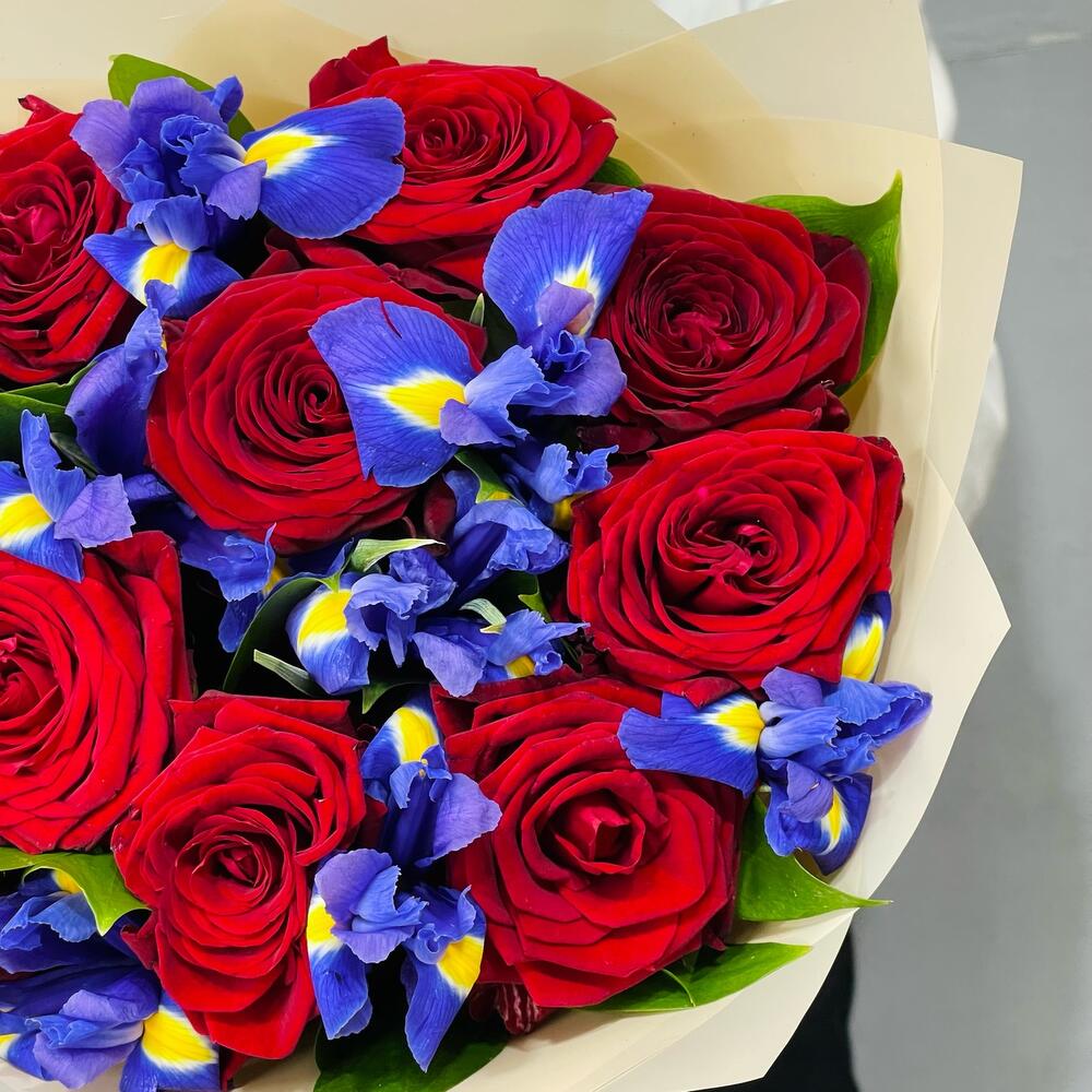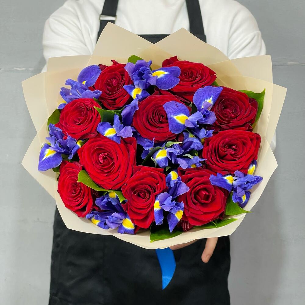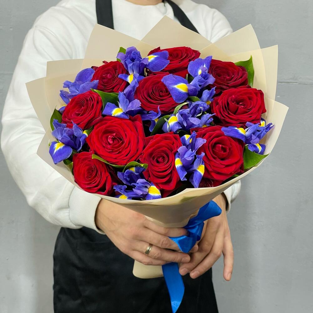Роза красная - 10 шт. Зелень - 10 шт. Лента атласная - 1 шт. Упаковка дизайнерская - 3 шт. Ирис Blue Magic - 9 шт.