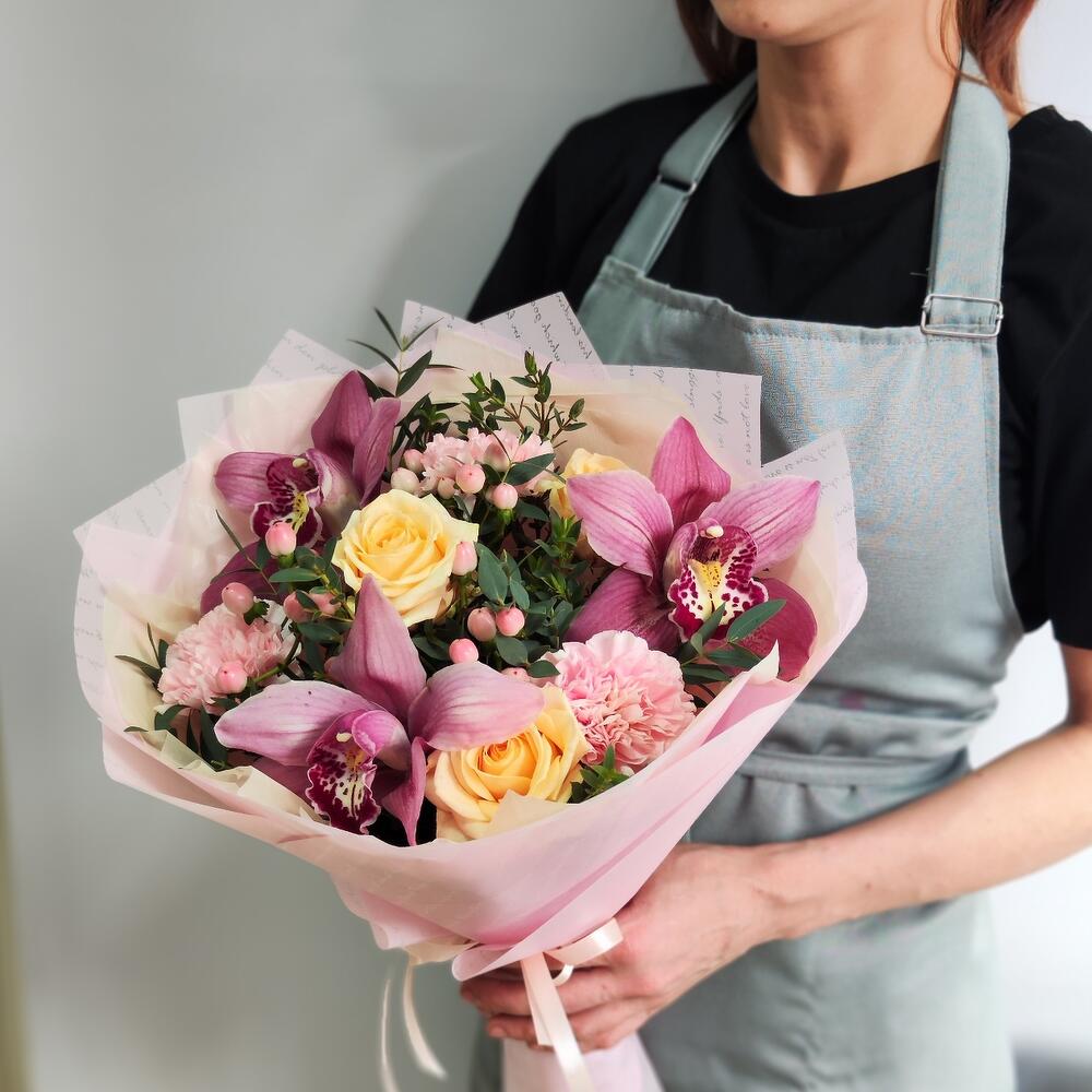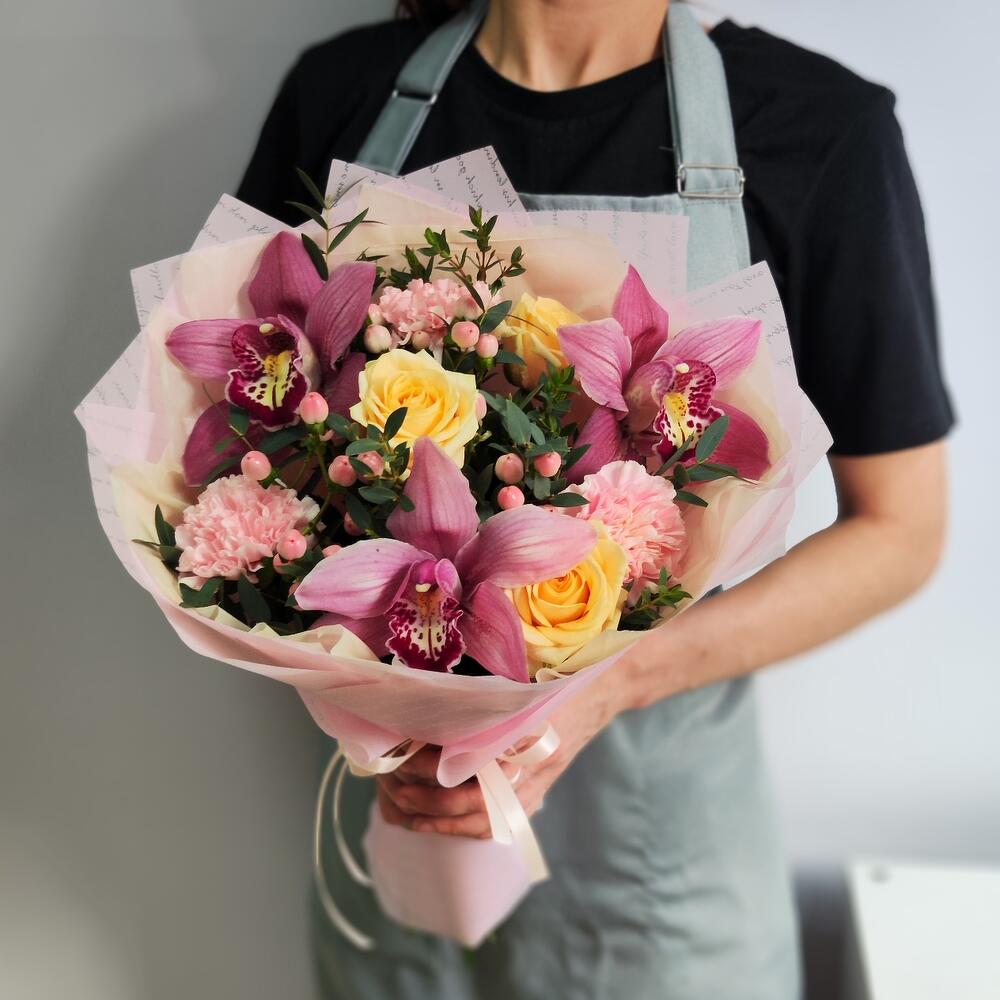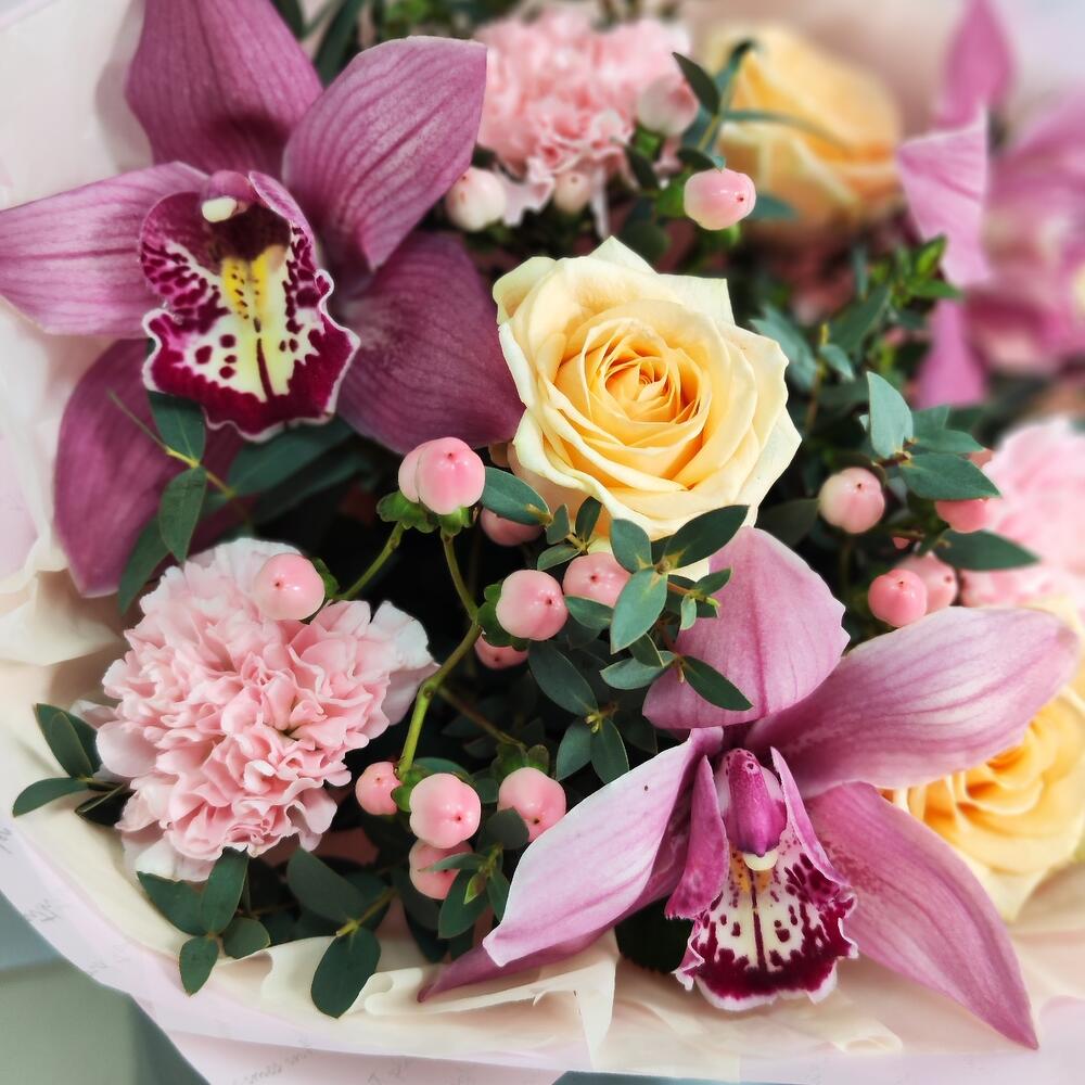 Роза кремовая - 3 шт. Гвоздика розовая - 3 шт. Гиперикум розовый - 3 шт. Орхидея Цимбидиум розовая - 3 шт. Эвкалипт первифолиа - 2 шт. тишью кремовое - 1 шт. пленка нежно розовая - 1 шт.