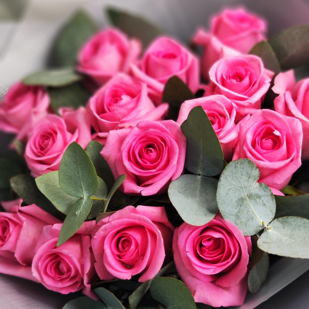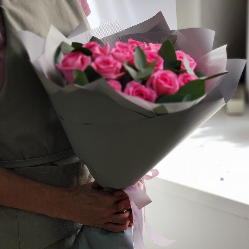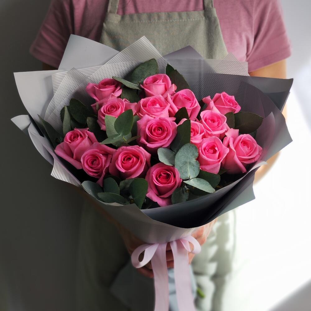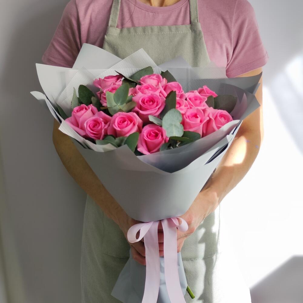Лента атласная – 1 шт. Роза розовая 50 см – 15 шт. Эвкалипт Baby Blue – 3 шт. пленка матовая серая – 1 шт. пленка полоска матовая – 1 шт.